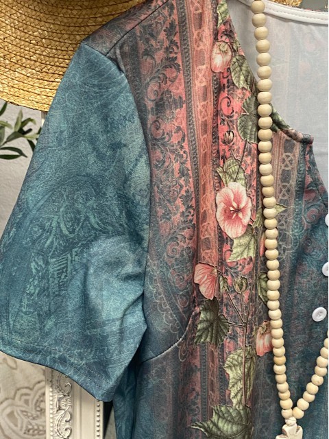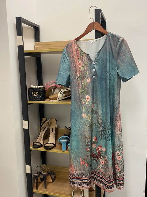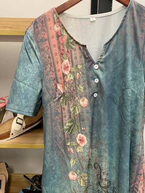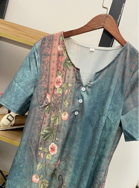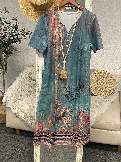 Navy Floral Print Short Half Sleeve Split Neck Dress