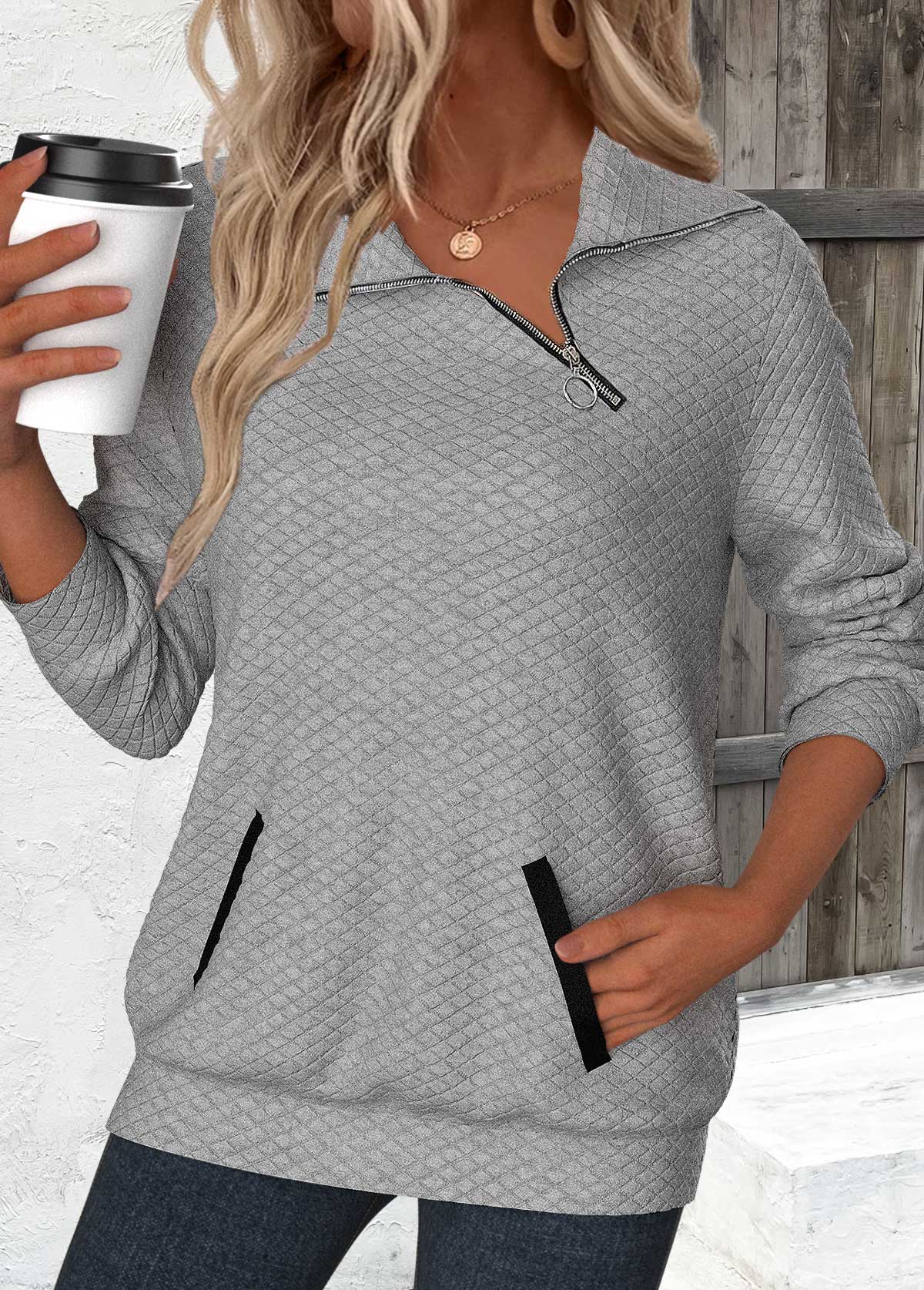 women's clothes / Tops / Sweatshirts&Hoodies  /  Grey Jacquard Long Sleeve Asymmetrical Neck Sweatshirt