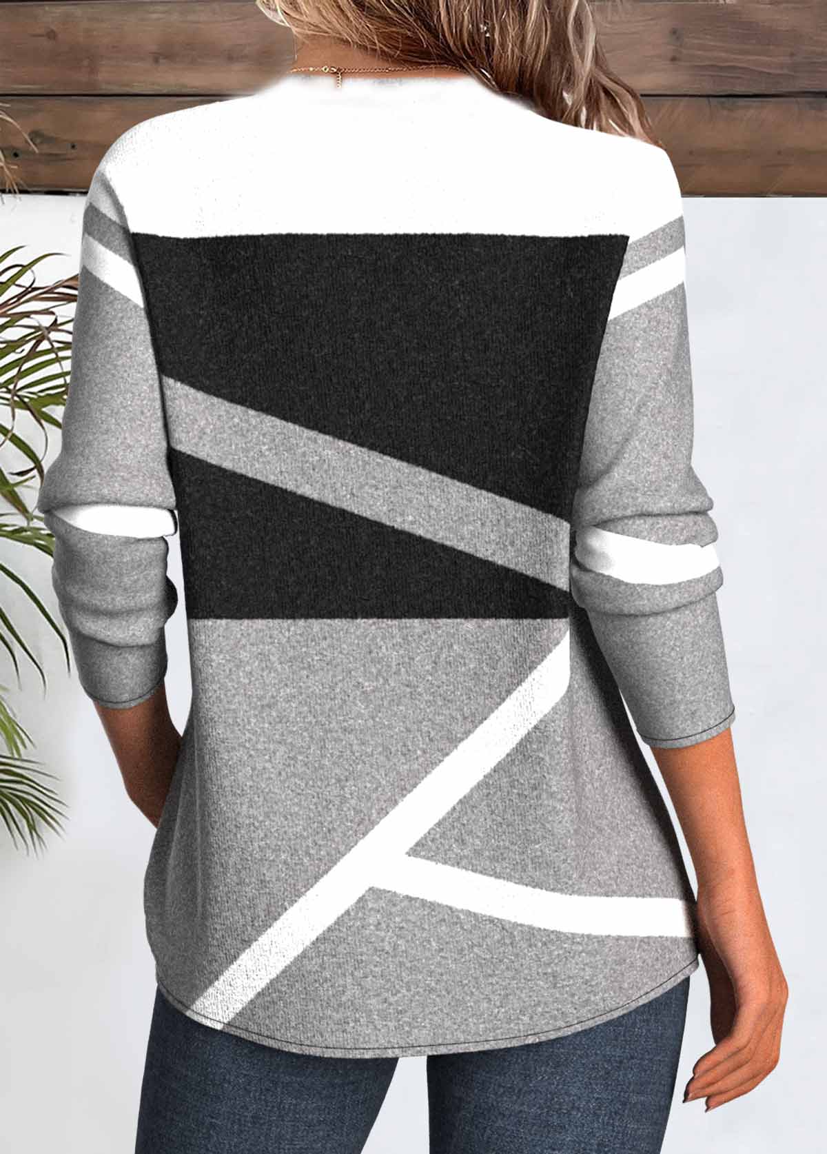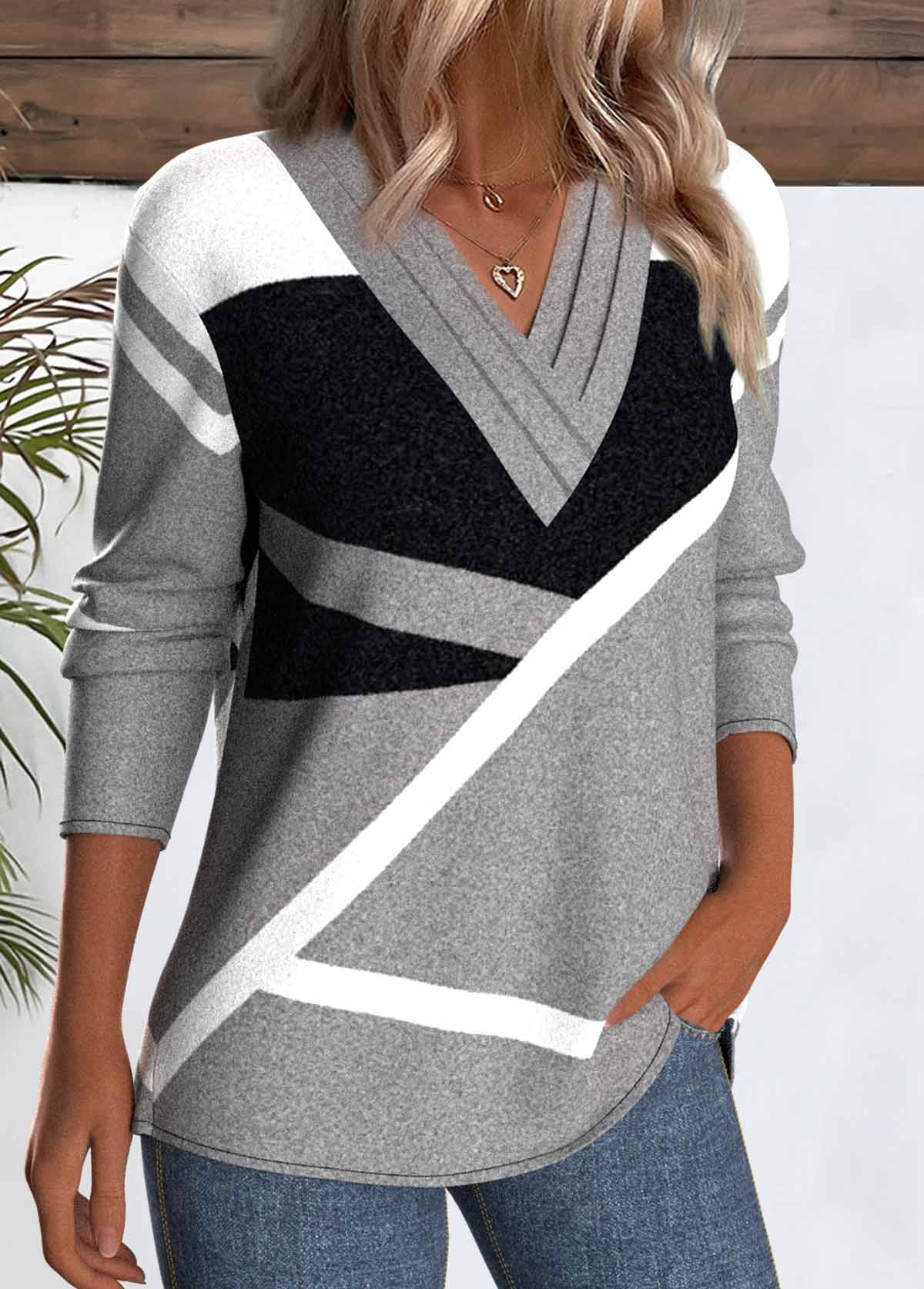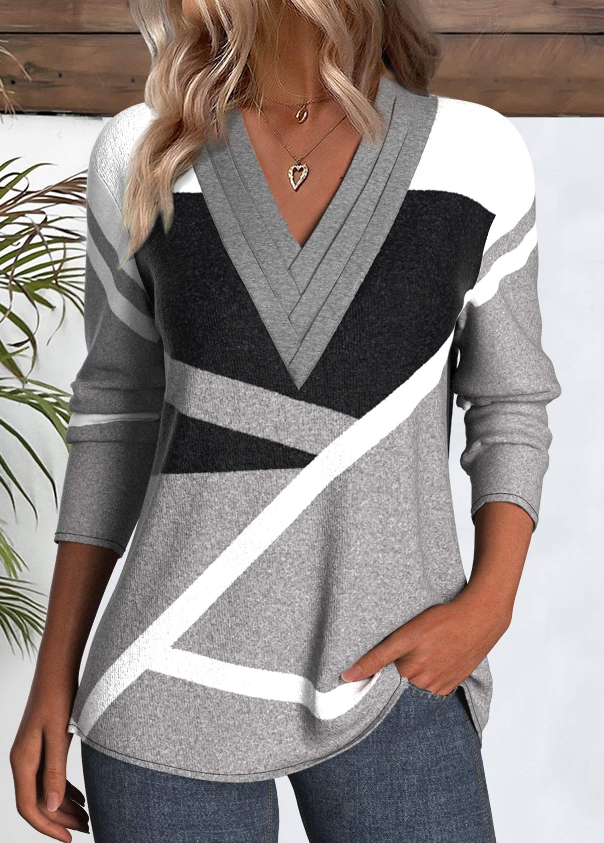 Elevate your casual wardrobe with this grey V-neck embroidered T-shirt, featuring bold geometric panels that add an artistic edge. The tummy-covering cut ensures a flattering silhouette, while the soft knit fabric provides all-day comfort. It’s the perfect blend of unique style and everyday ease.