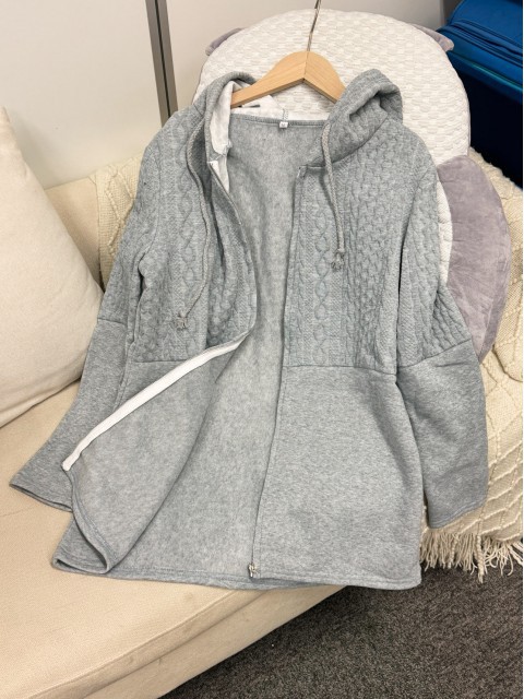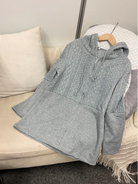 Elevate your casual look with this grey hoodie tunic. Crafted from soft, knitted fabric, it offers mid-length coverage with a cozy drawstring hood and a convenient zip closure. Perfect as both a sweatshirt and a light jacket, it's ideal for effortless everyday style.