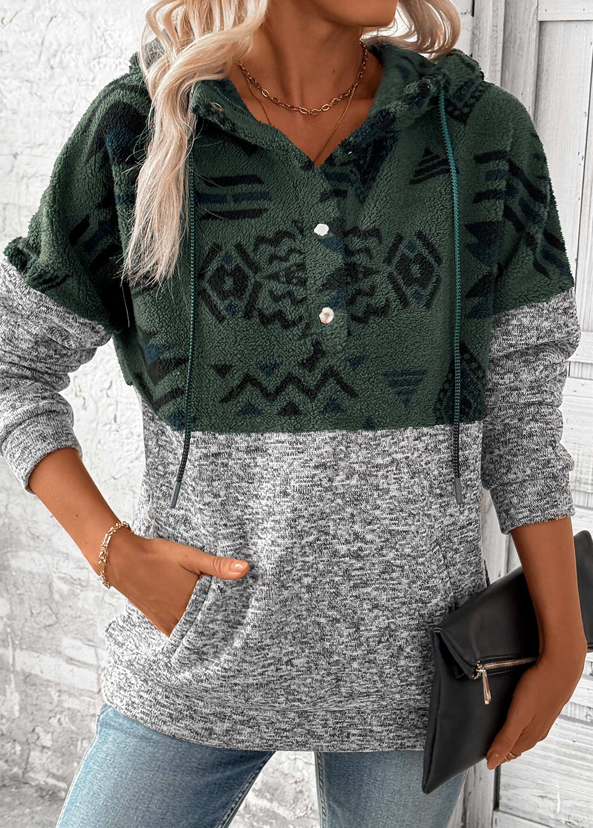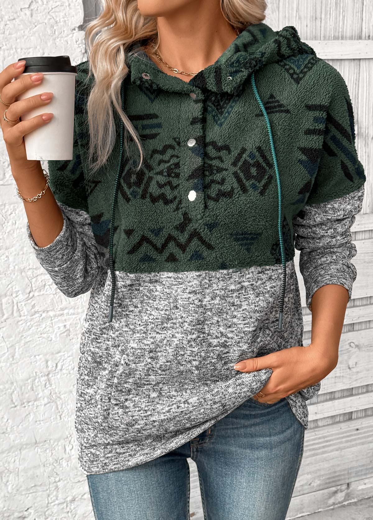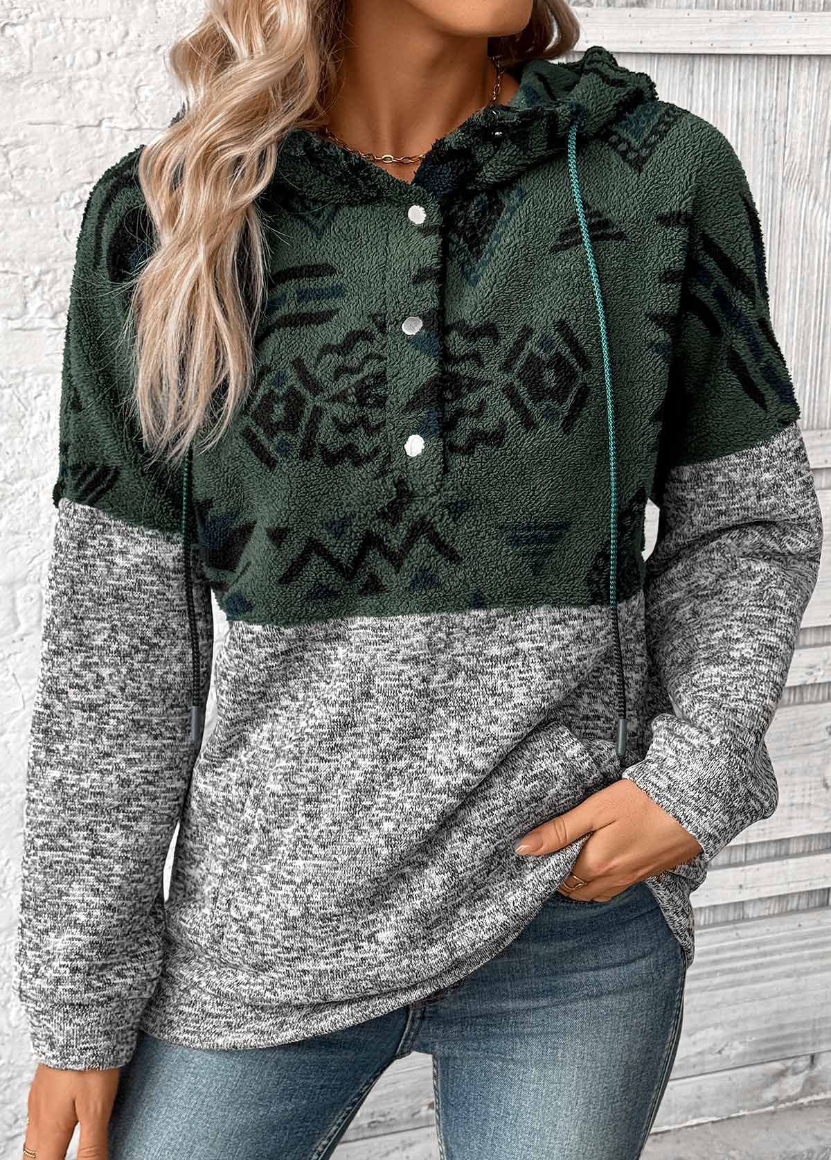 women's clothes / Tops / Sweatshirts&Hoodies  /  Grey Patchwork Tribal Print Long Sleeve Hoodie