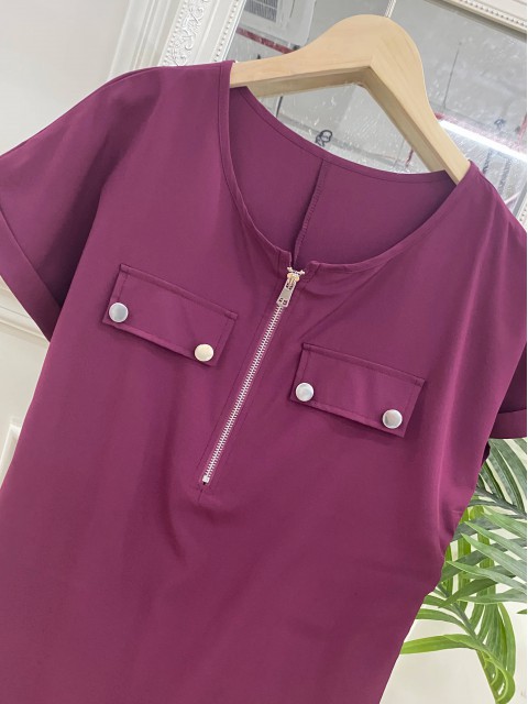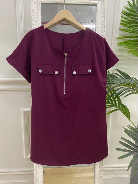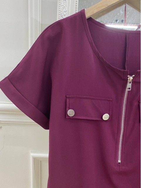 Wine Red Tummy Coverage Long Sleeve Split Neck Blouse