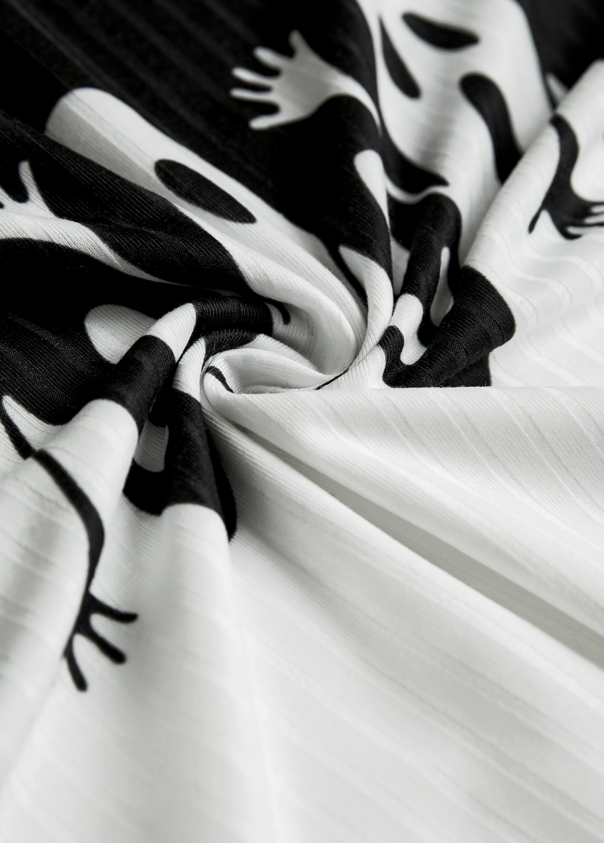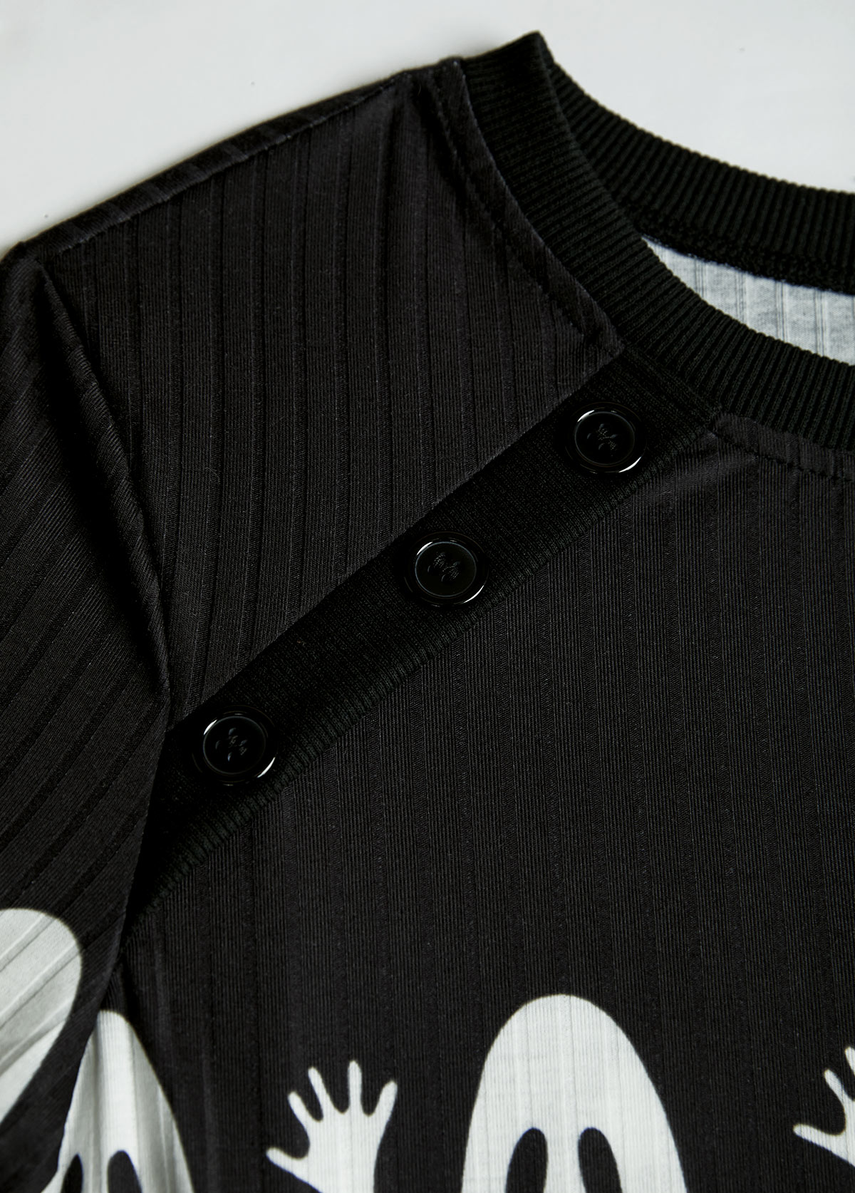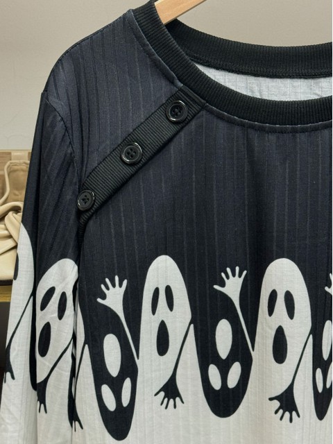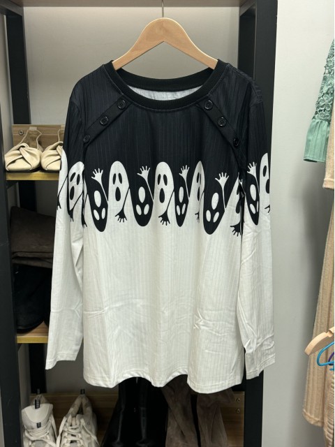 Embrace the spooky season with this black and white raglan tee. Featuring a playful Halloween design on the chest, its tunic length offers perfect tummy coverage. Crafted from soft, stretchy knit fabric, it’s ideal for festive fun or casual wear.