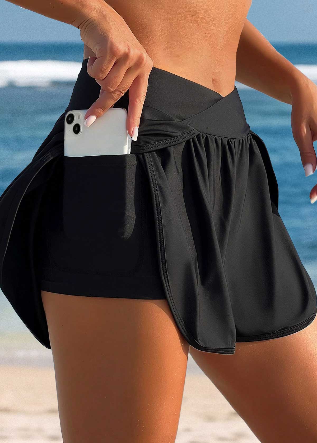 Quick Drying High Waisted Black Pocket Beach Shorts