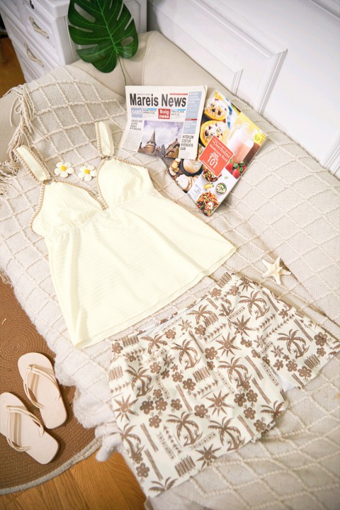 Mid Waisted Tropical Plants Print Beige Tankini Set