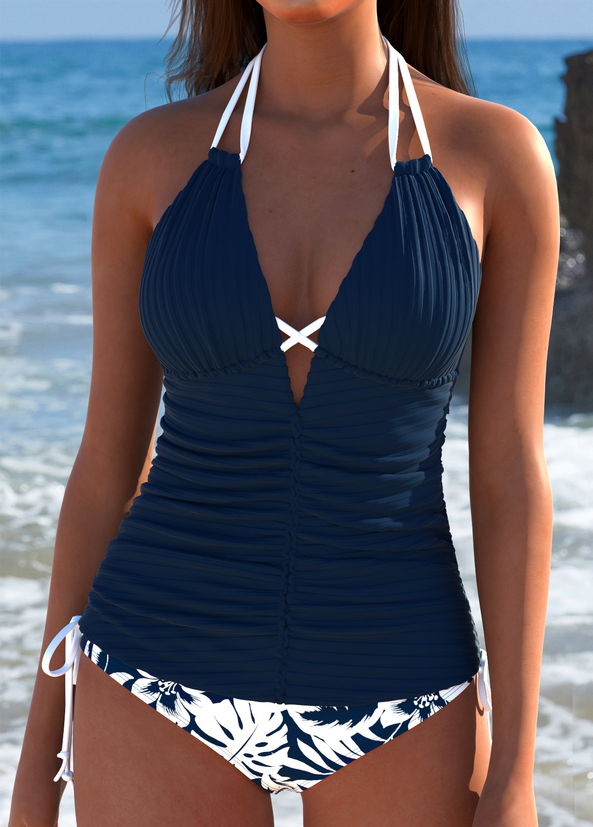 Mid Waisted Floral Print Navy Tankini Set