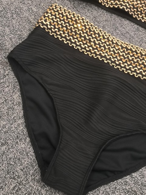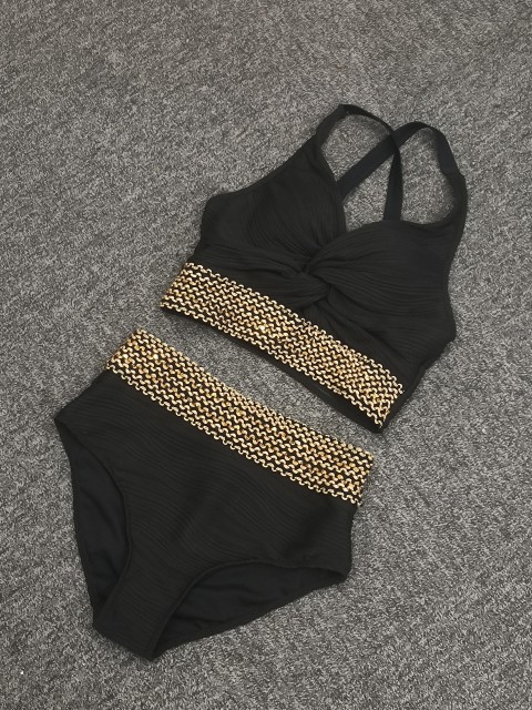 Mid Waisted Patchwork Black Bikini Set