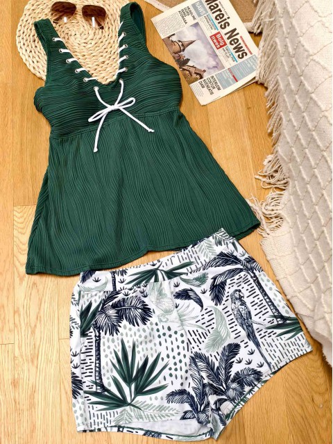 Tummy Coverage Mid Waisted Tropical Plants Print Tankini Set