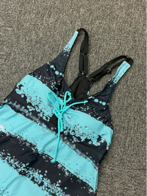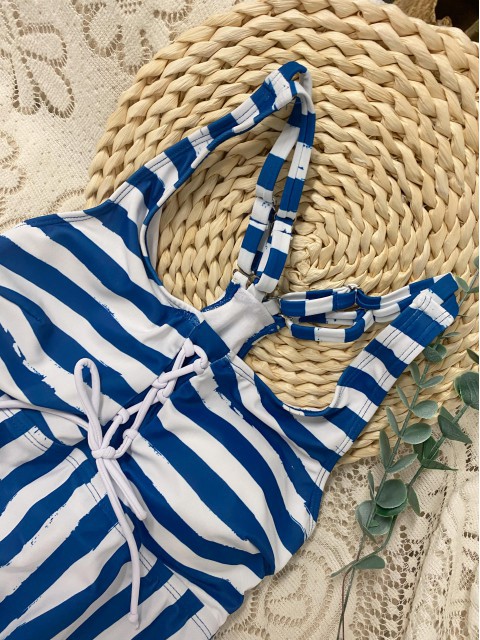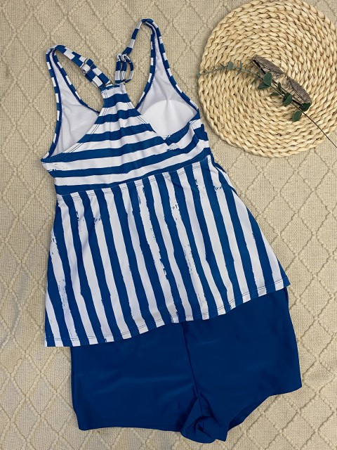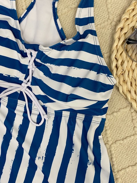 Patchwork Mid Waisted Striped Navy Tankini Set