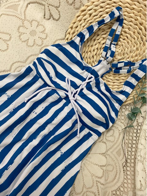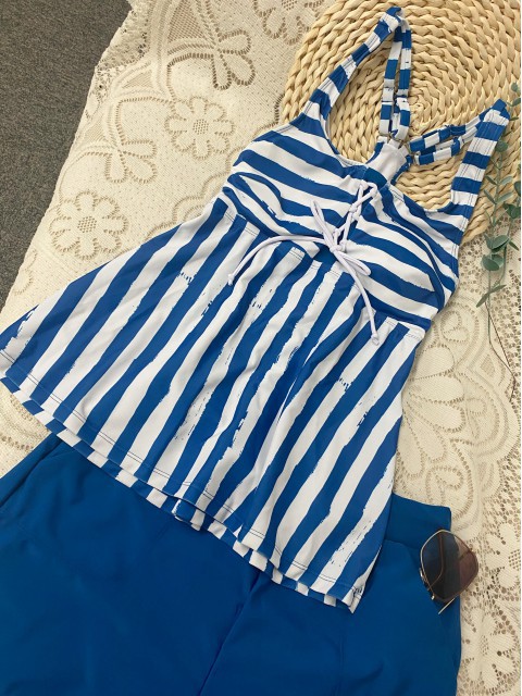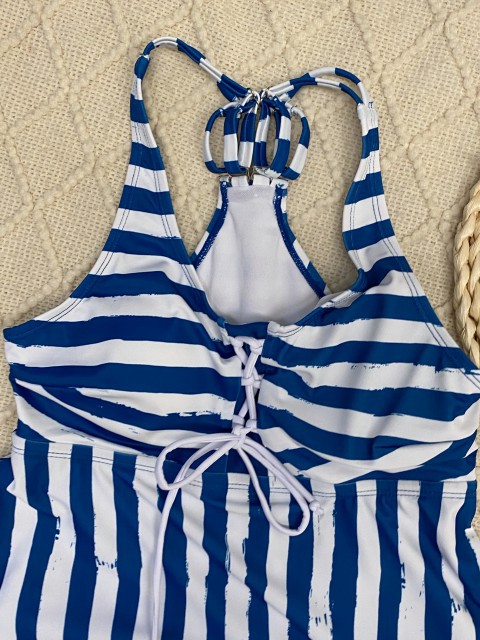 Tummy Coverage Mid Waisted Striped Light Blue Tankini Set