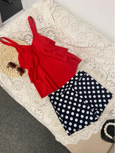 Bowknot Leaf Print Coral Red Tankini Top