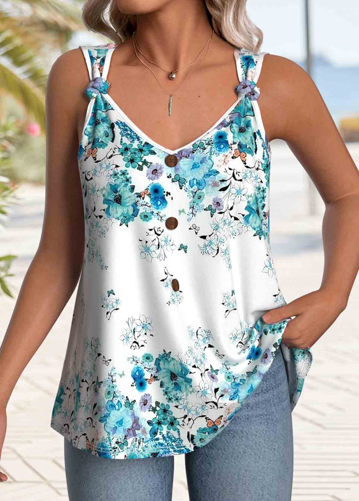 White Button Sleeveless V Neck Tank Top