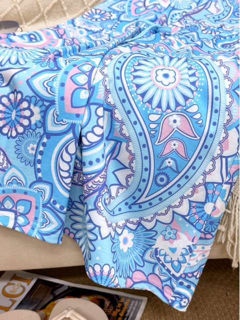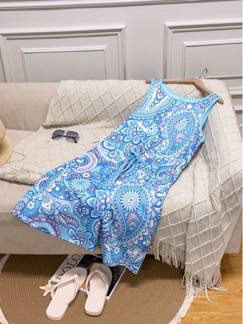 Home  /  Dresses  /  Light Blue Drawstring Paisley Print Short Sleeveless Dress