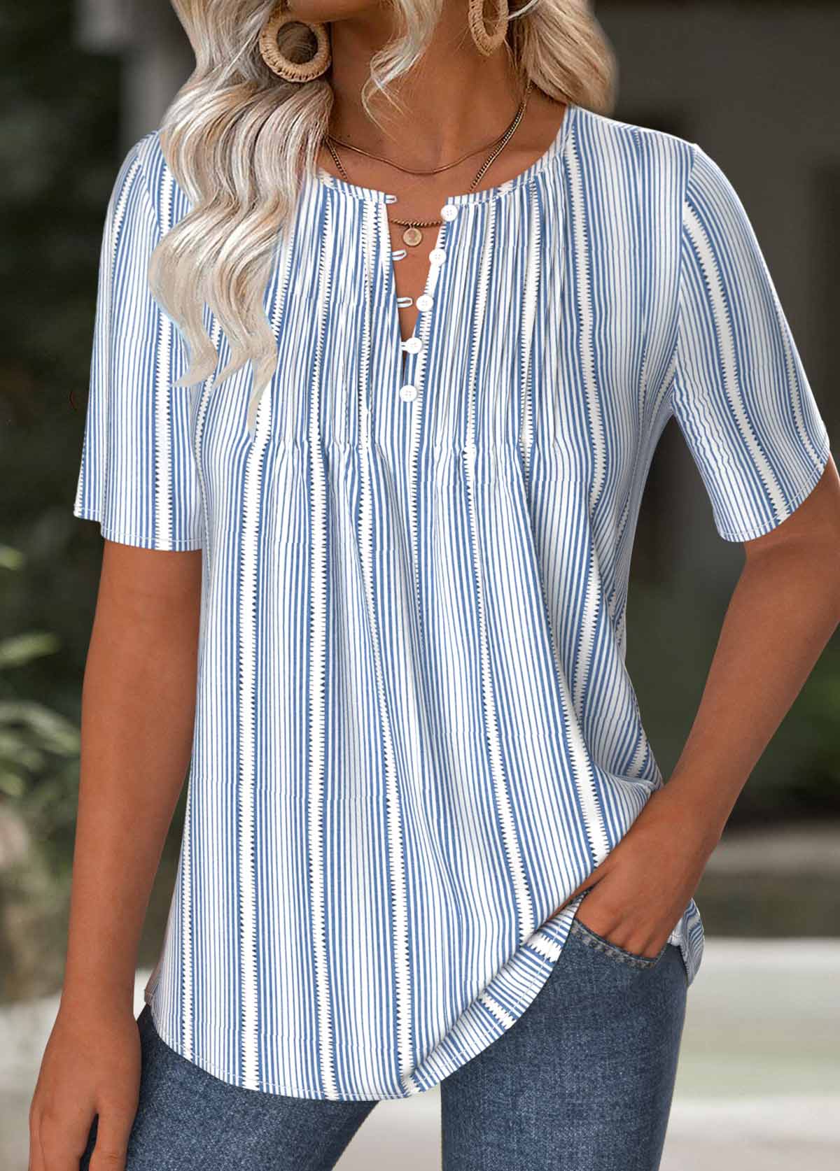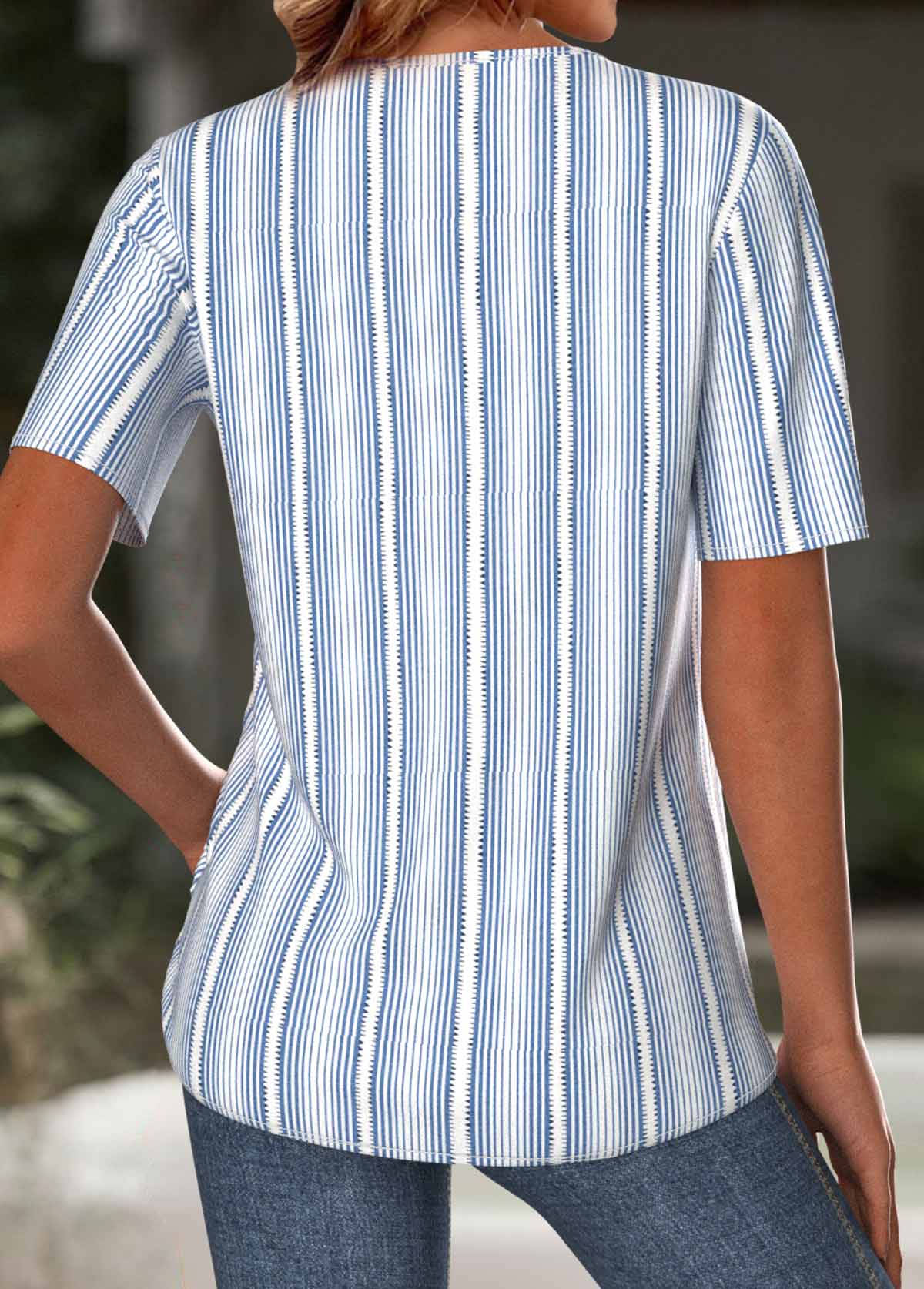 Blue Striped Short Sleeve Split Neck T Shirt