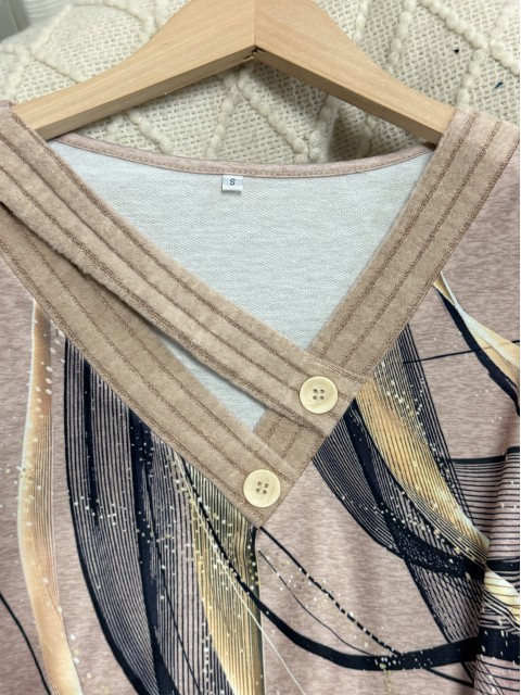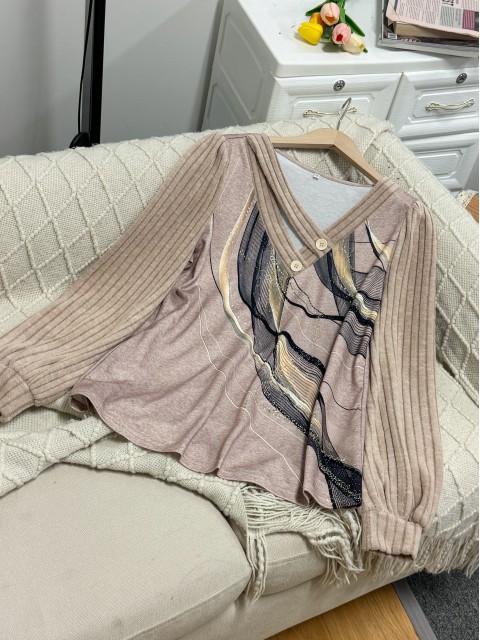 Embrace effortless style with this light camel long-sleeve tee. Featuring elegant bishop sleeves and a unique geometric print, it combines comfort with fashion. The relaxed fit offers tummy coverage, making it an ideal choice for a laid-back yet chic look. Perfect for casual days out.
