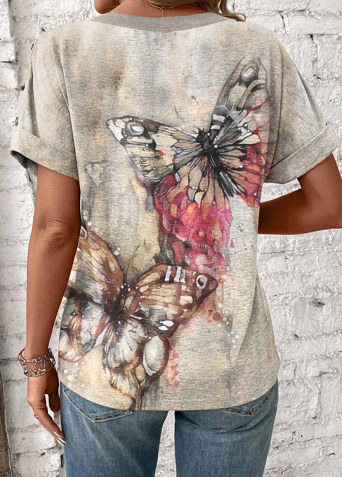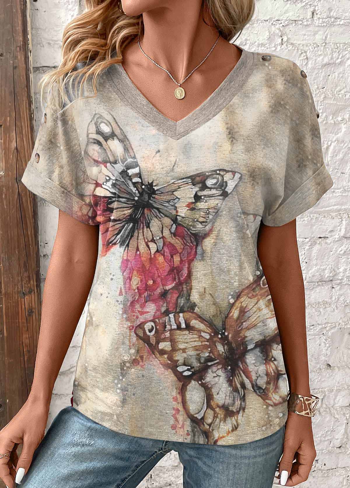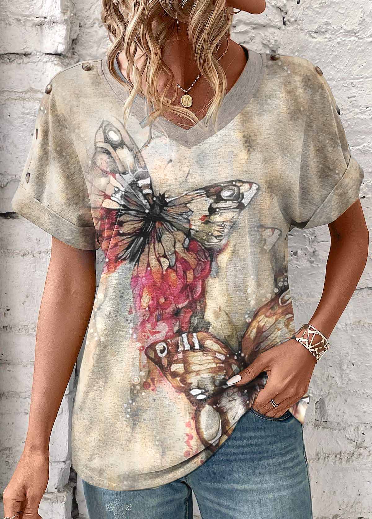 SALEMODLILY® Light Camel Patchwork Butterfly Print Short Sleeve T Shirt