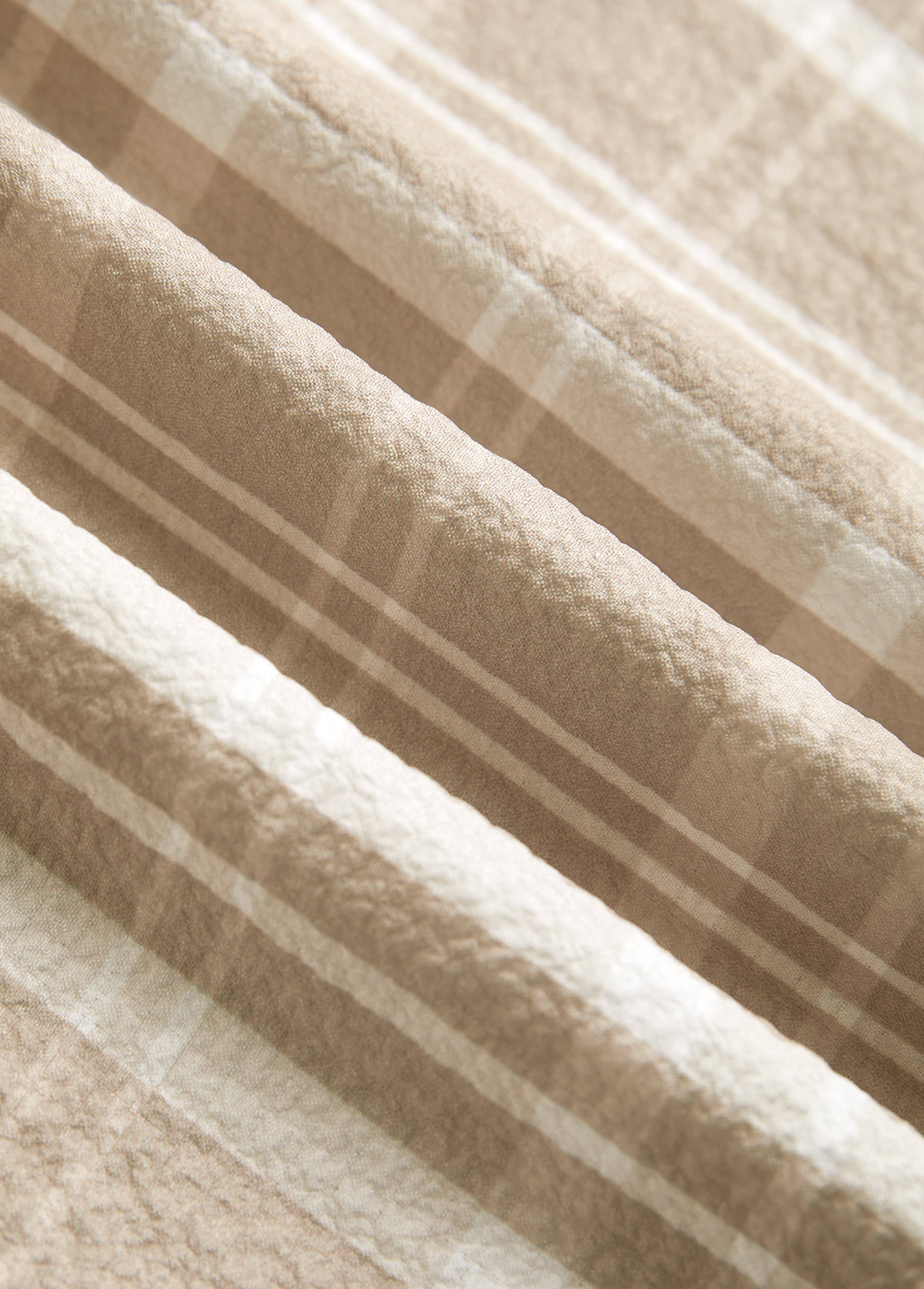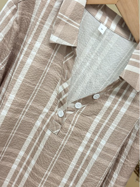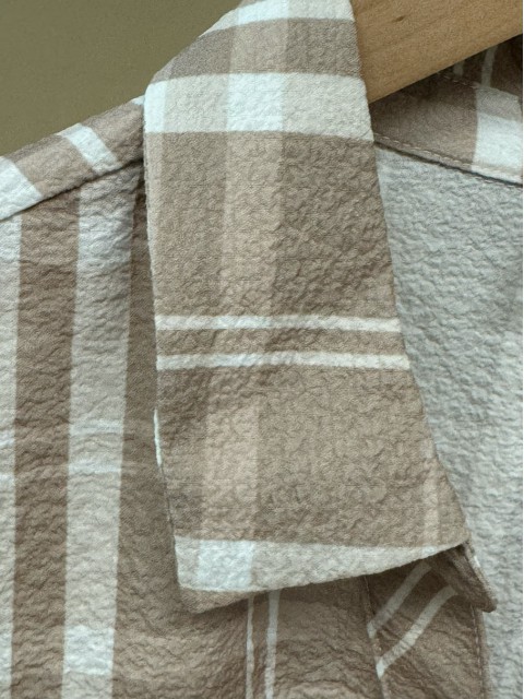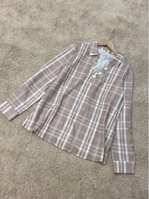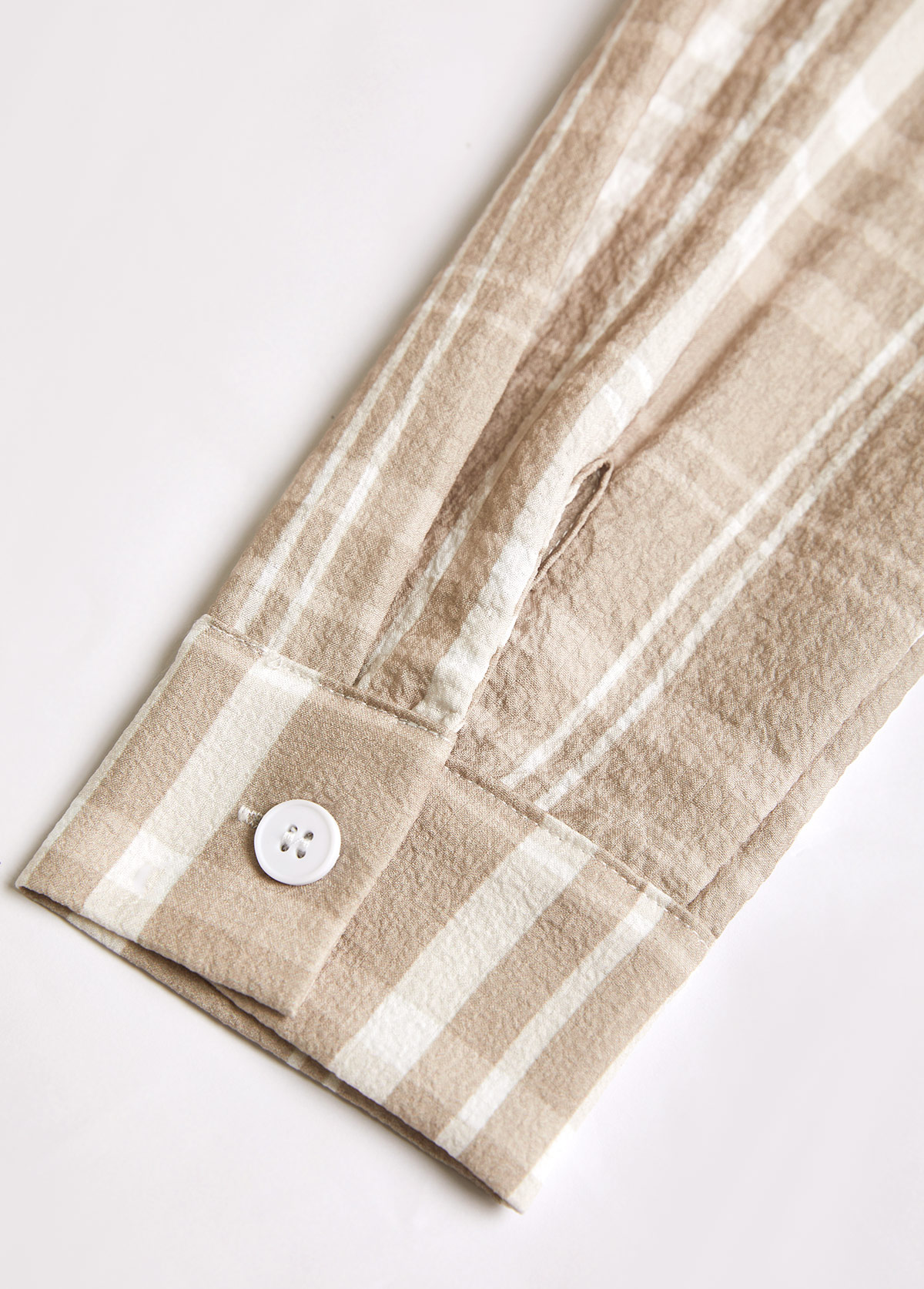 Imagine effortless elegance with this soft, beige plaid blouse. Featuring a classic shirt collar and a mid-length tunic cut, it offers ultimate tummy coverage while maintaining comfort. Perfect for both everyday wear and work commutes, this piece blends style and practicality seamlessly.