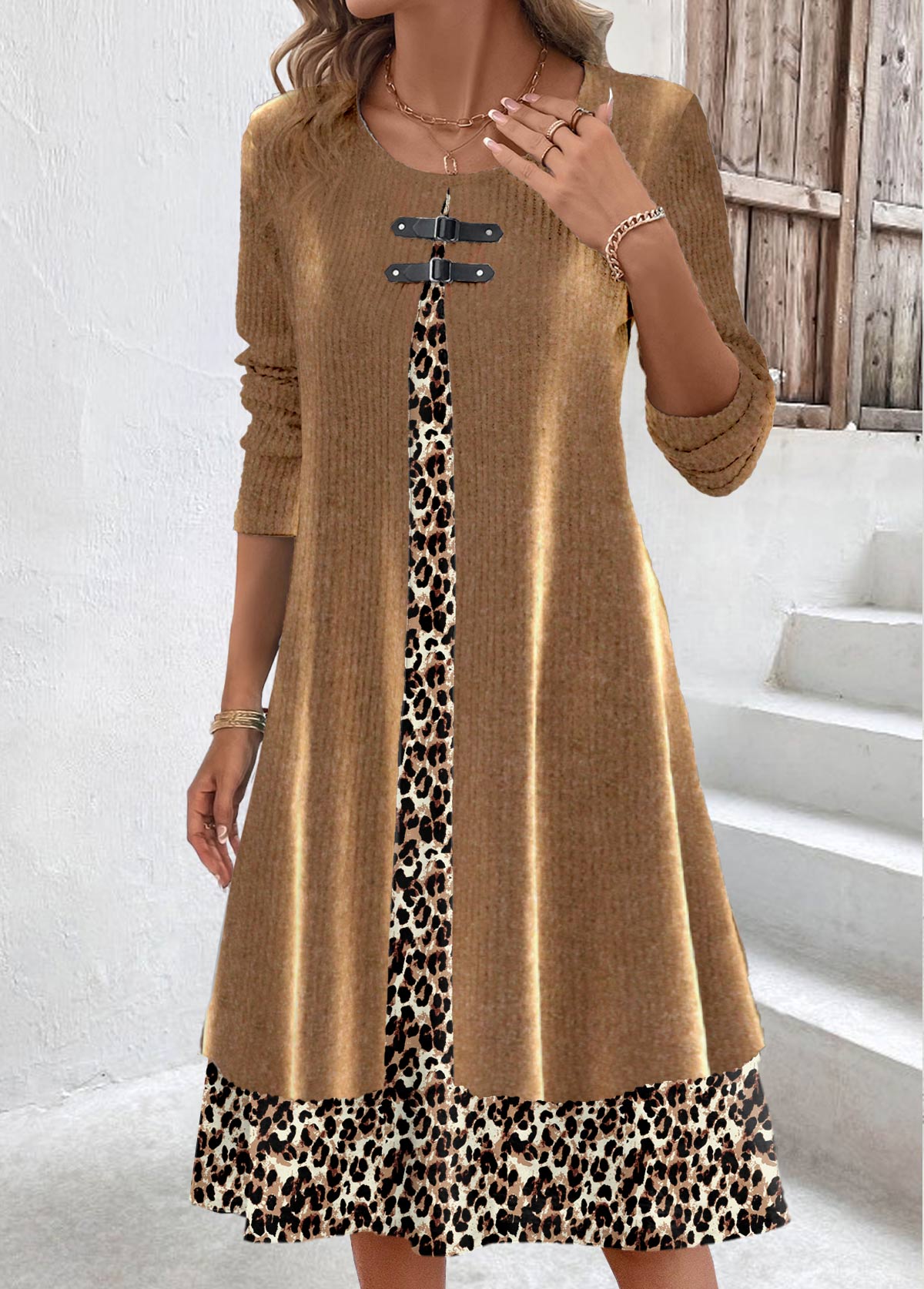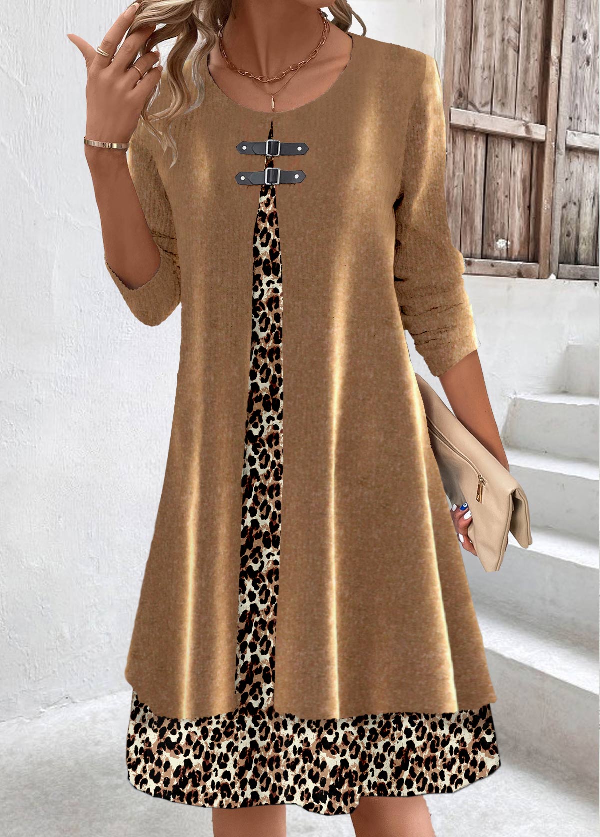 Light Coffee Fake 2in1 Leopard A Line Dress