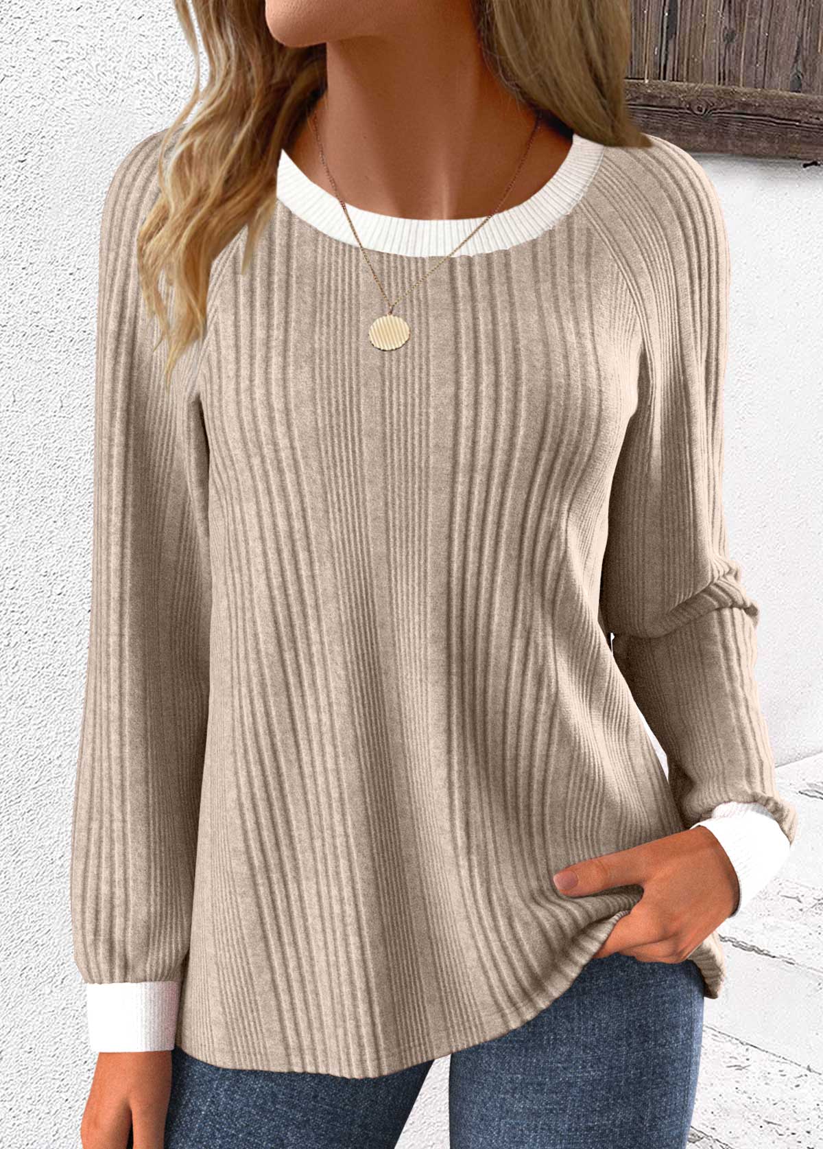 Light Coffee Patchwork Long Sleeve Round Neck Sweatshirt
