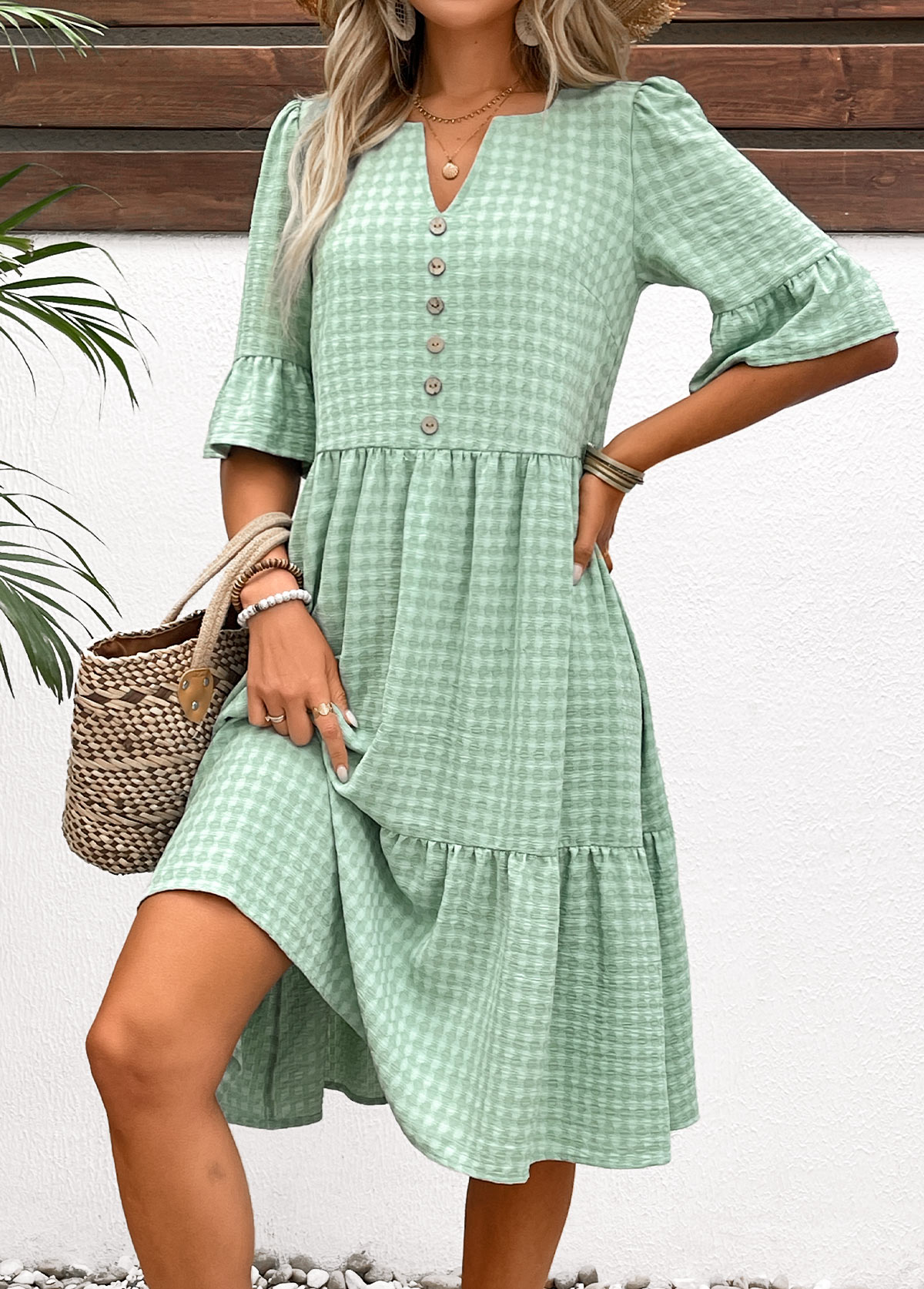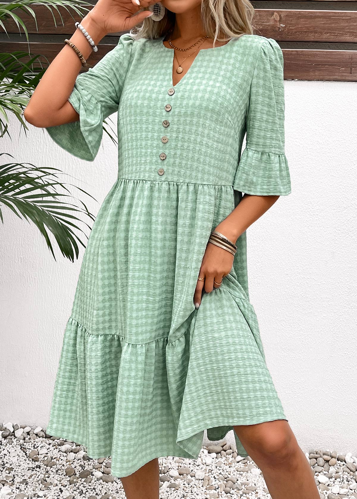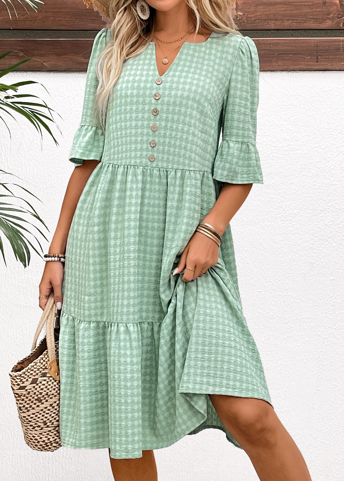 White Leaf Print Smocked Short Sleeve Split Neck Dress