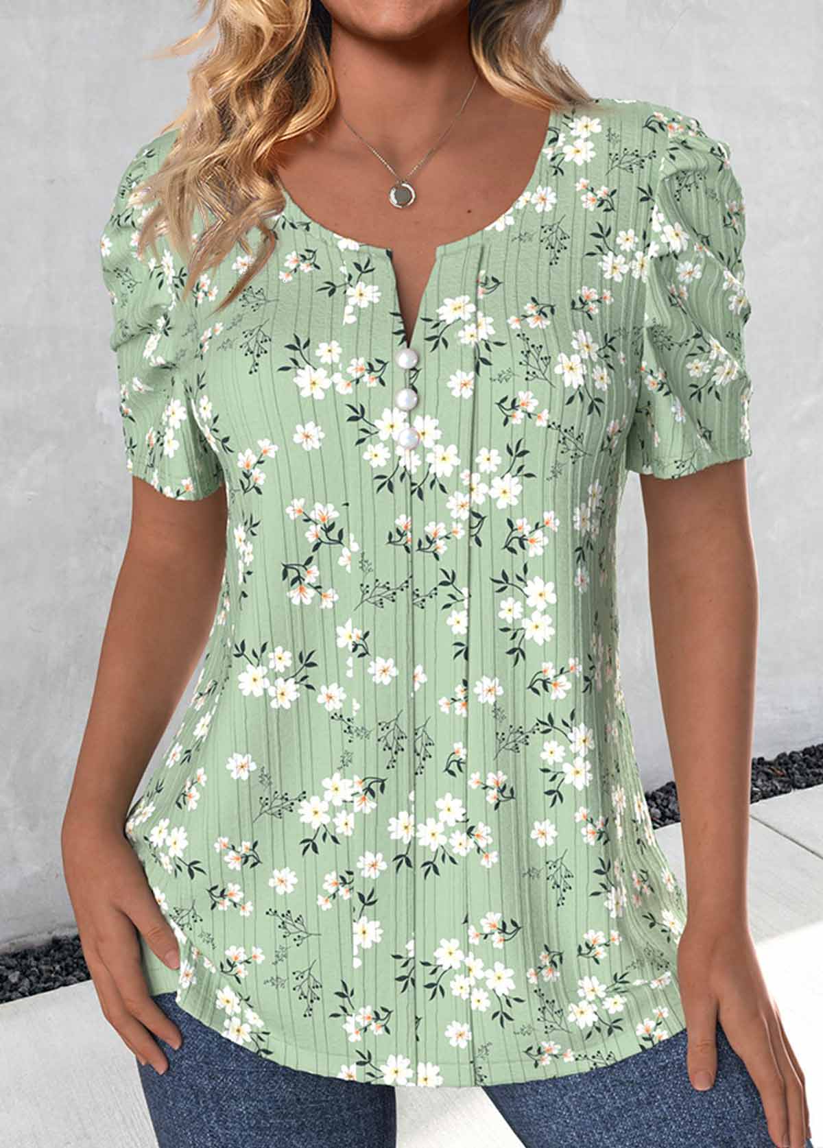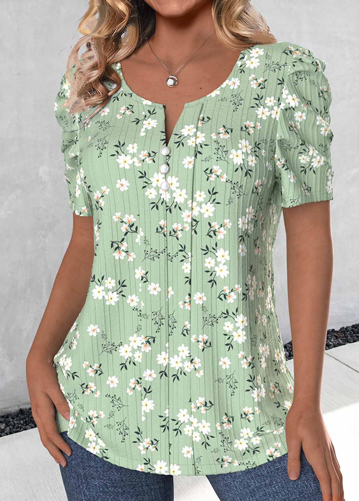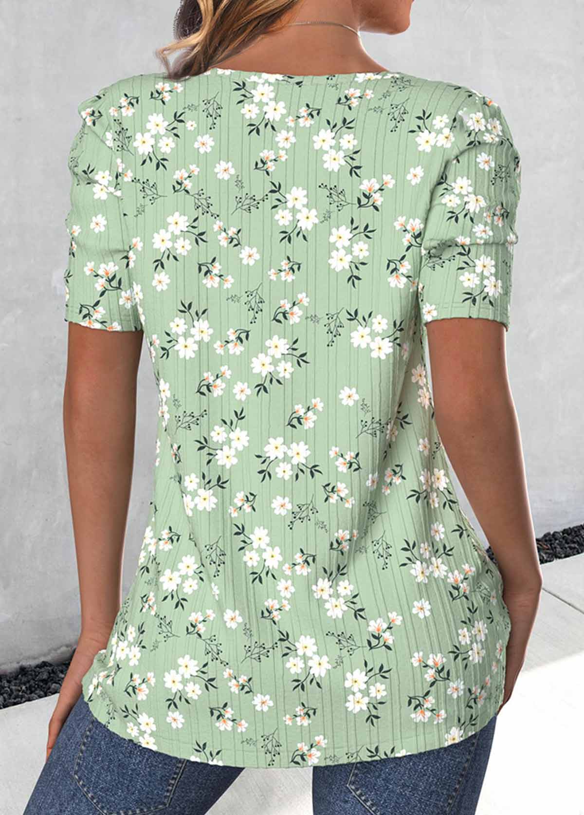 Light Green Ditsy Floral Print Tuck Stitch T Shirt