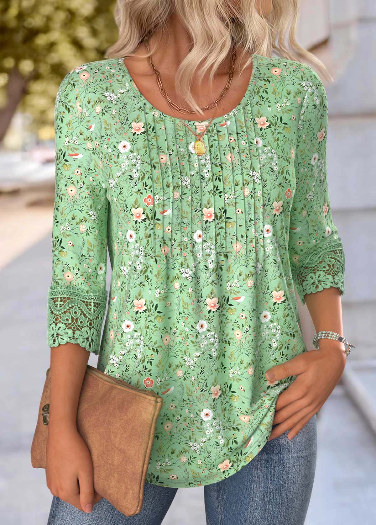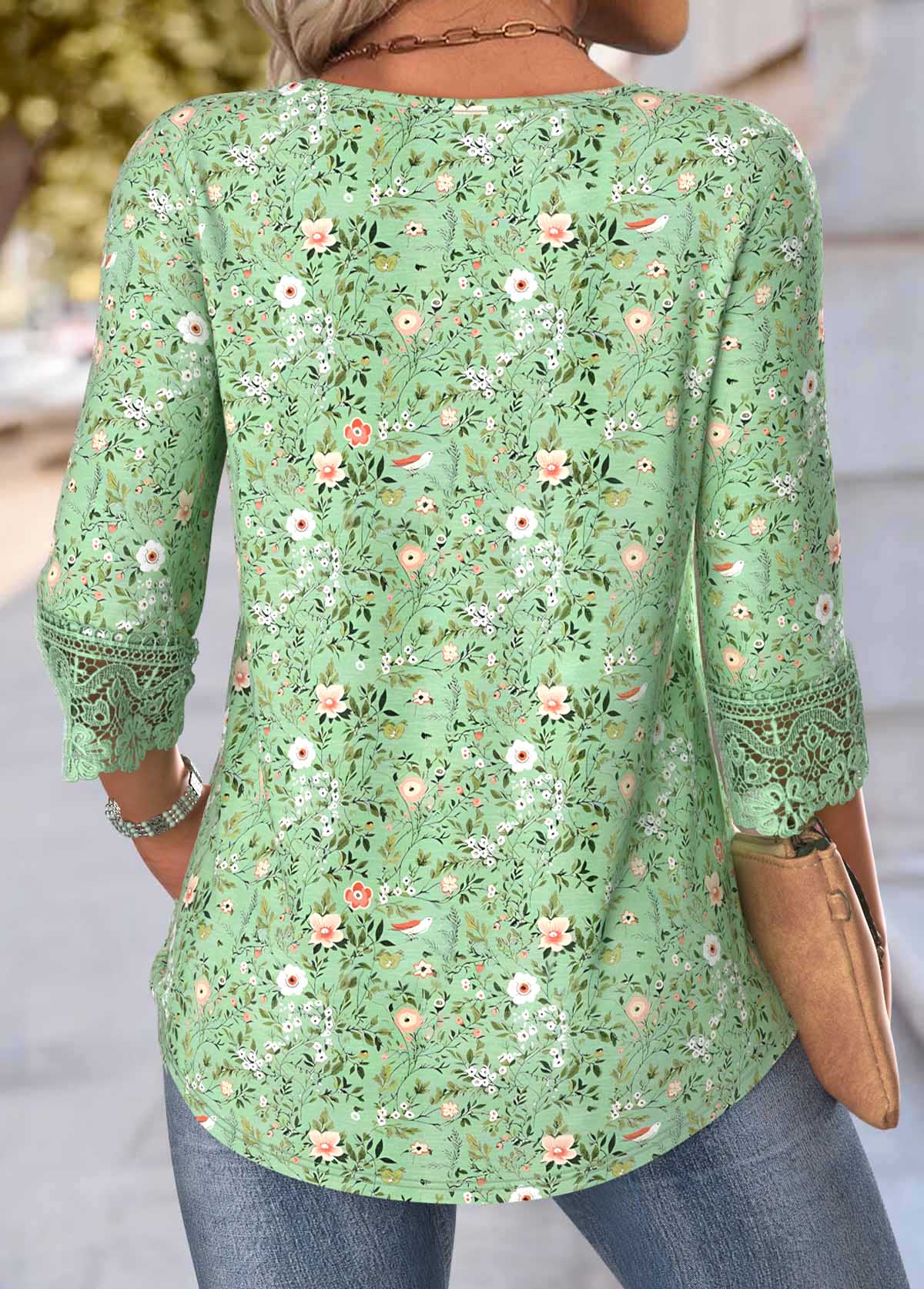 Light Green Ditsy Floral Print Curved Hem T Shirt