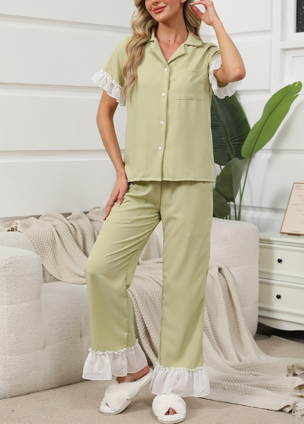 women's clothes / Loungewear / Loungewear Sets  /  Light Green Short Sleeve Lounge Top and Pants