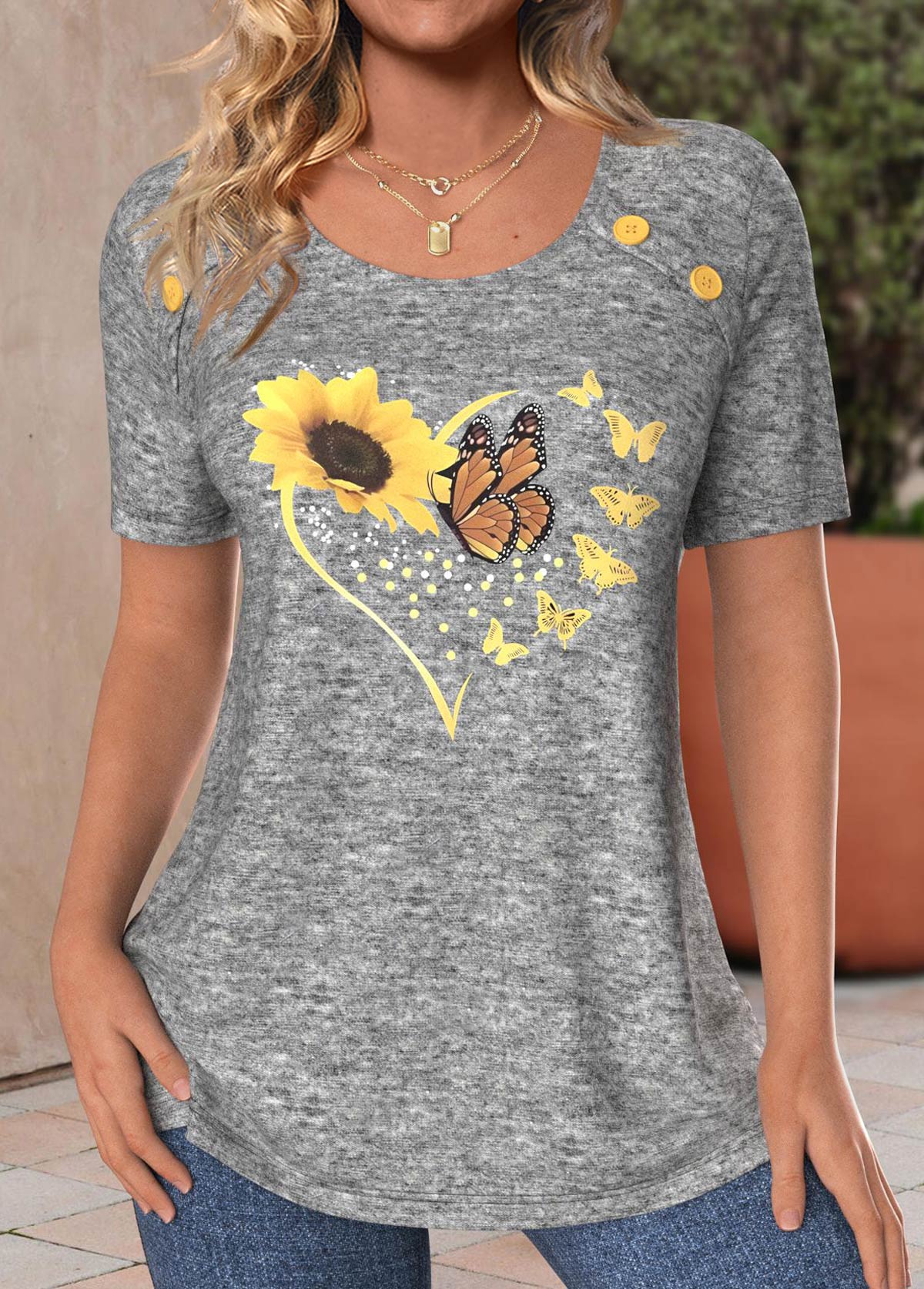 women's clothes / Tops / Tees&T-shirts  /  Light Grey Marl Button Sunflower Print T Shirt