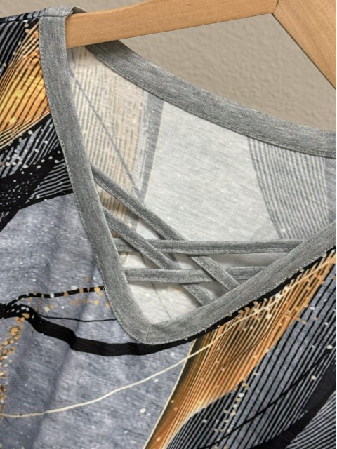 Step up your style with this light linen-colored crossover T-shirt, featuring elegant gold geometric accents for a hint of glam. Its mid-length cut offers great tummy coverage, while the soft knit fabric ensures comfort and ease. Perfect for a casual day out, it blends relaxed sophistication with standout design.