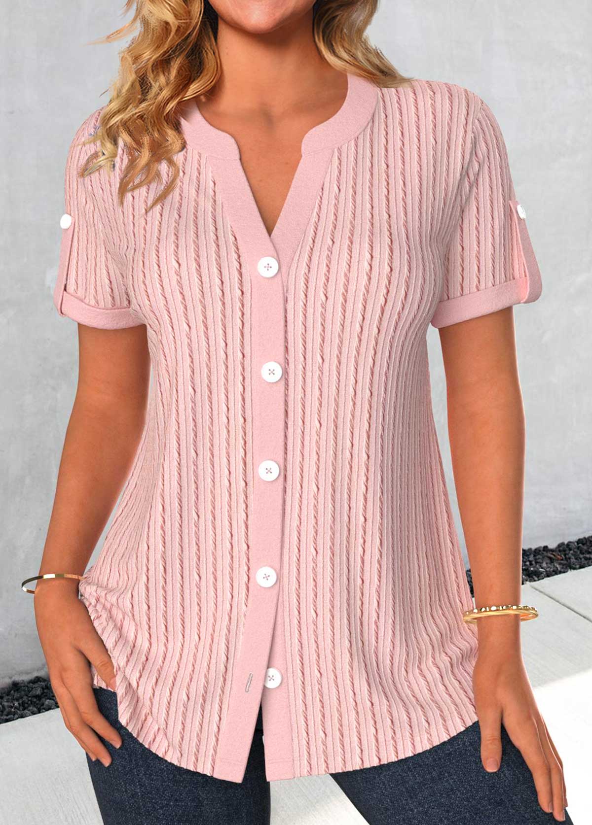 Light Pink Button Geometric Print 3/4 Sleeve Blouse