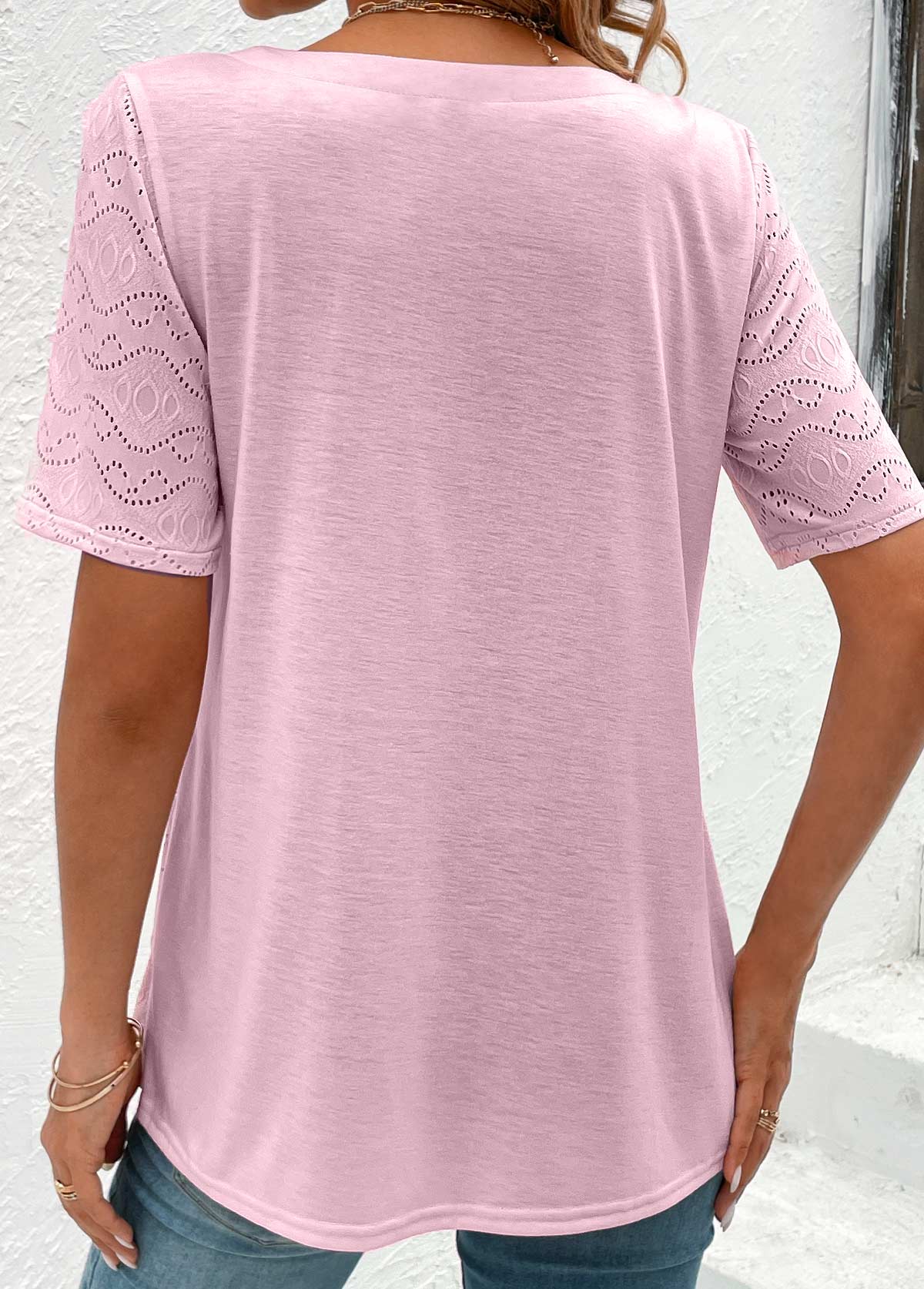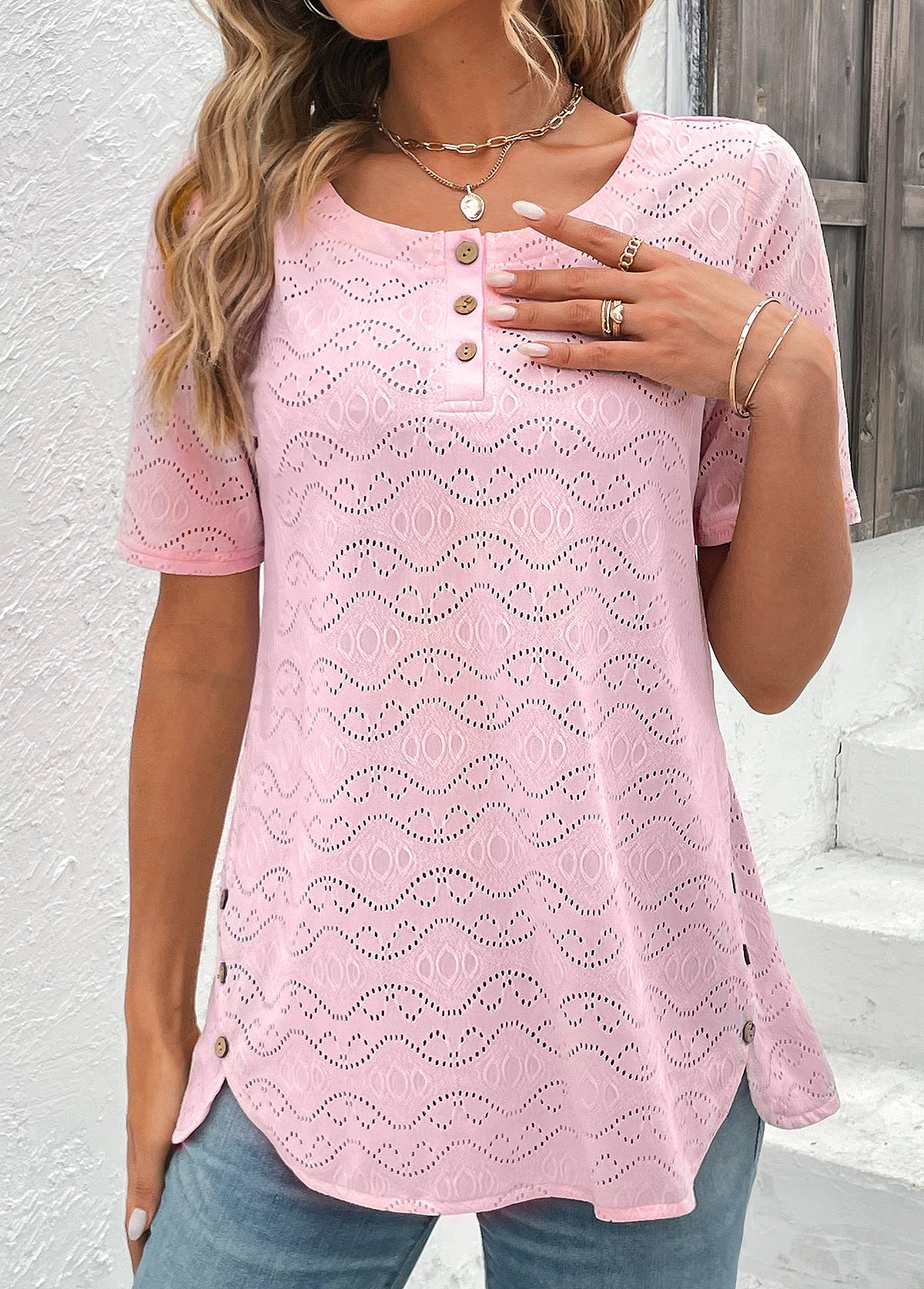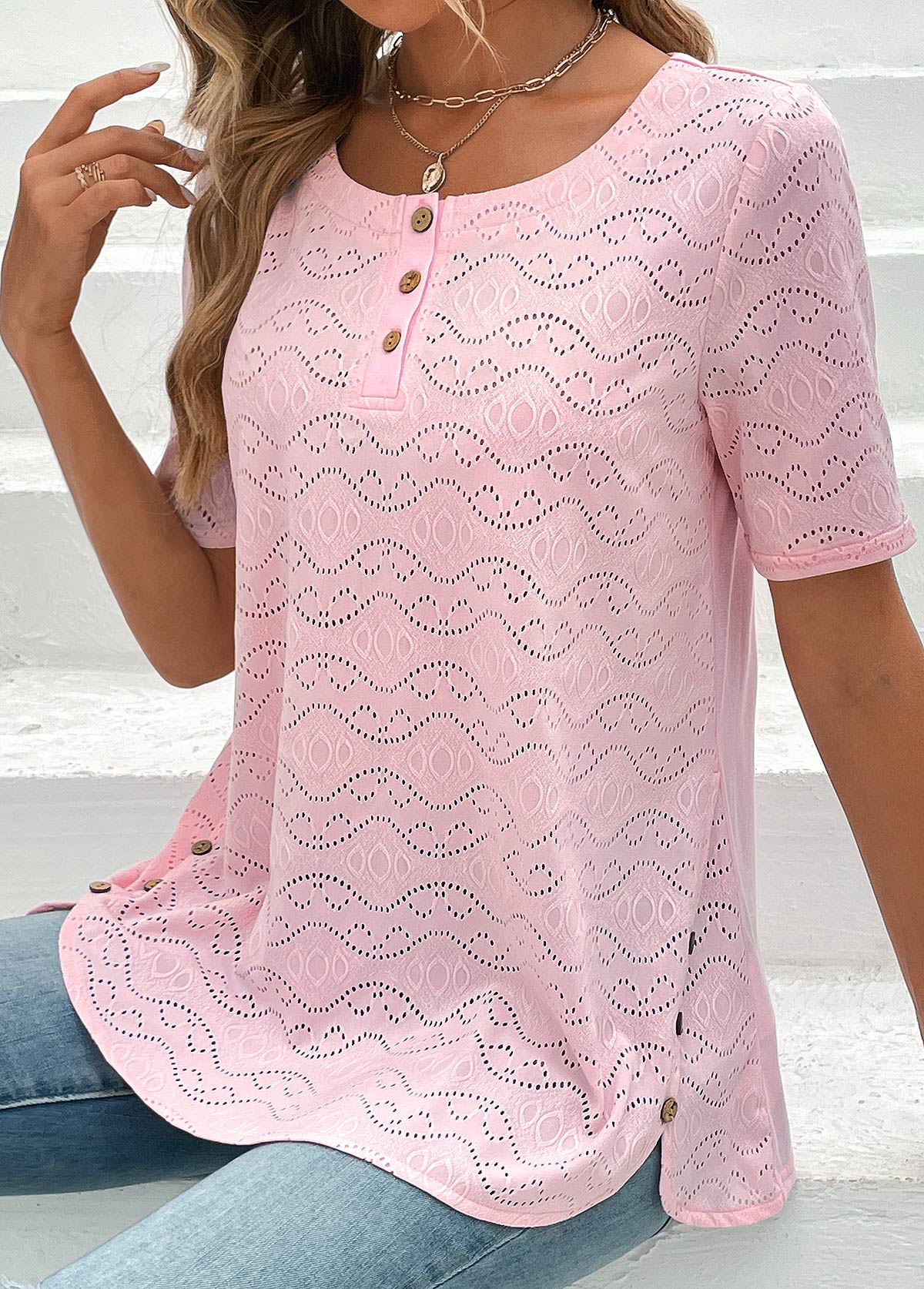 women's clothes / Tops / Blouses  /  Light Pink Button Short Sleeve Round Neck Blouse