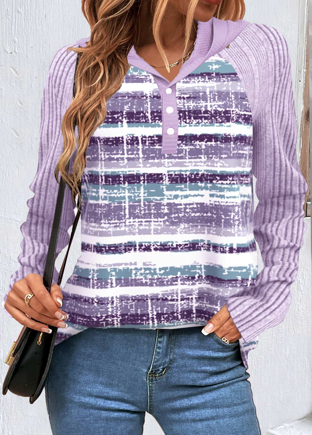 women's clothes / Tops / Sweatshirts&Hoodies  /  Light Purple Button Striped Long Sleeve Hooded Sweatshirt
