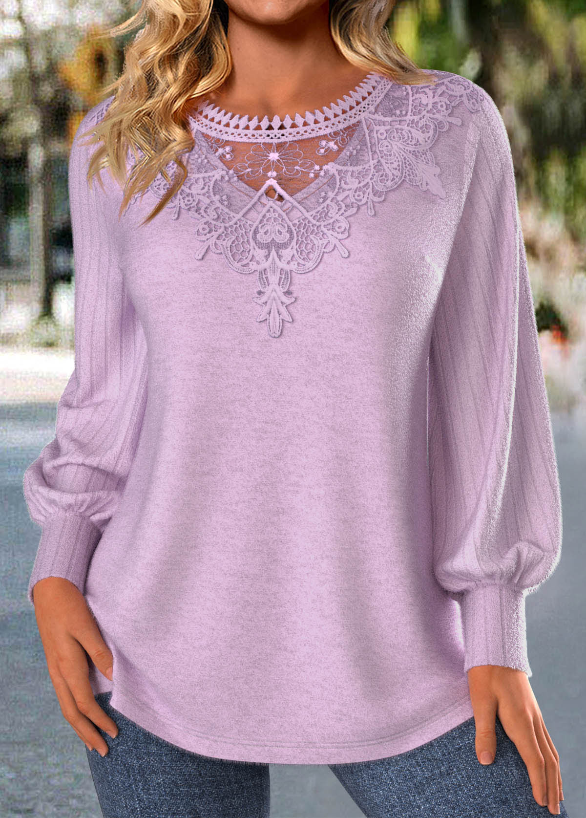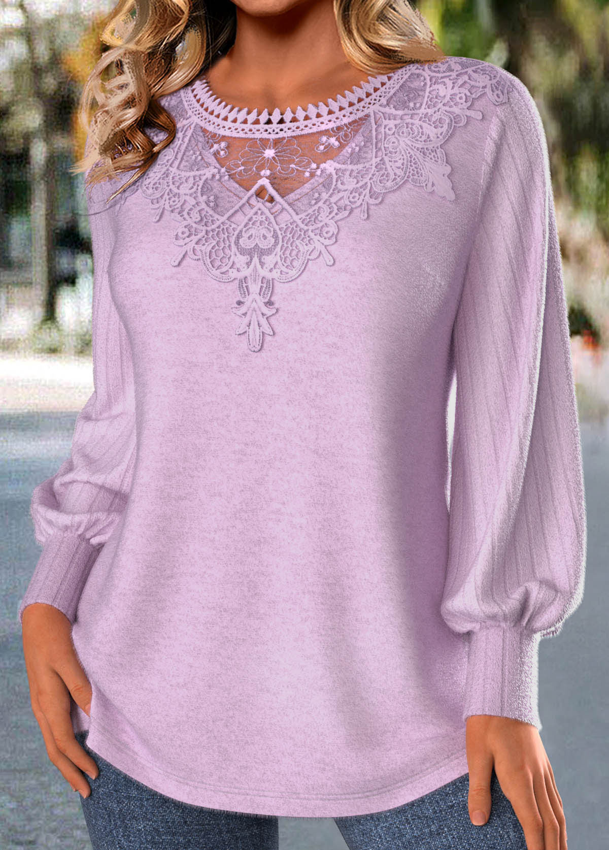 women's clothes / Tops / Tees&T-shirts  /  Light Purple Embroidery Long Sleeve Round Neck T Shirt