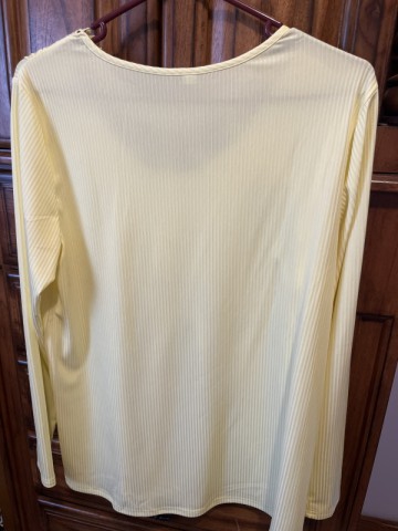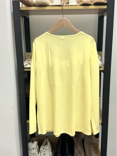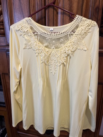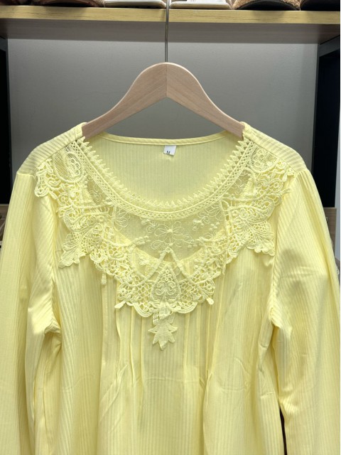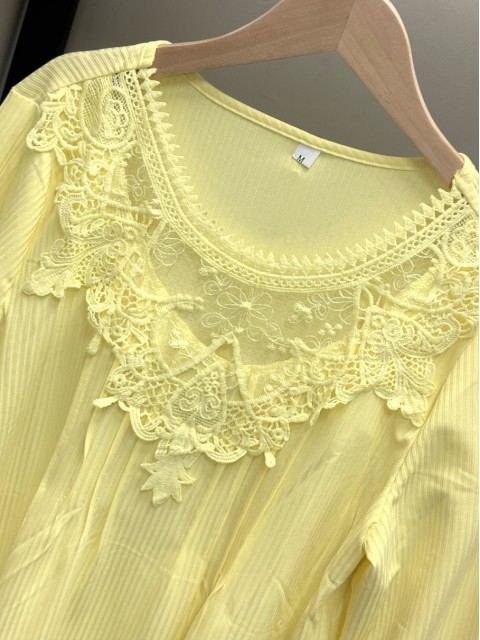 Illuminate your everyday style with this light yellow tunic tee. Crafted from soft knitted fabric, it features a delicate lace patchwork collar that adds a touch of elegance. The mid-length cut offers flattering tummy coverage, combining casual comfort with a refined twist.