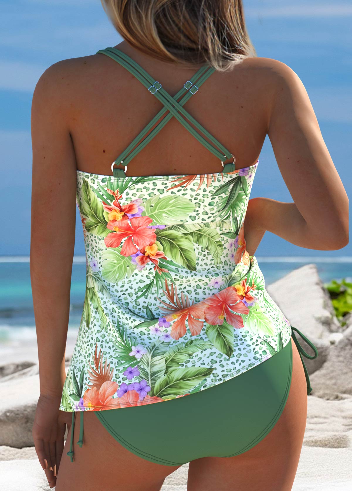 Sage Green Mid Waisted Tropical Plants Print Tankini Set
