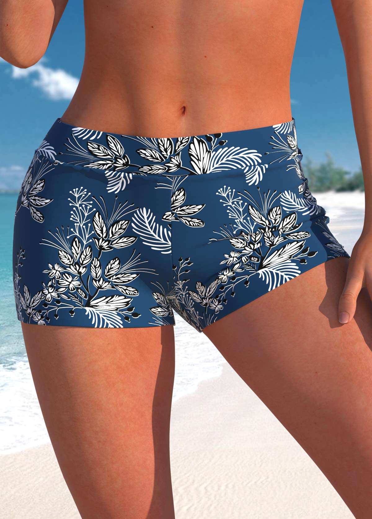 Tummy Coverage Mid Waisted Plants Print Navy Tankini Set
