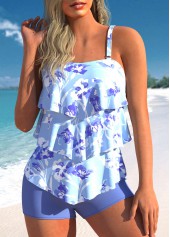 Curved Hem Cyan Tropical Plants Print Tankini Set