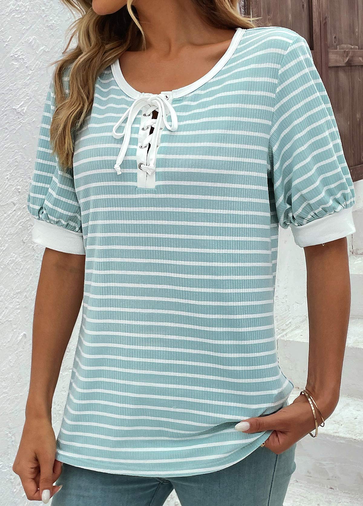 Mint Green Geometric Print Tummy Coverage Short Sleeve Blouse