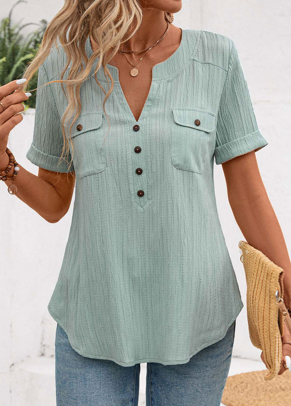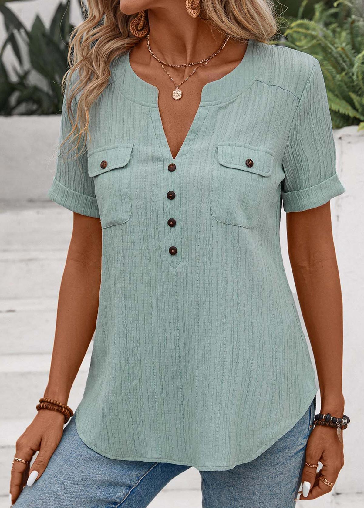 women's clothes / Tops / Blouses  /  Mint Green Patchwork Short Sleeve Split Neck Blouse