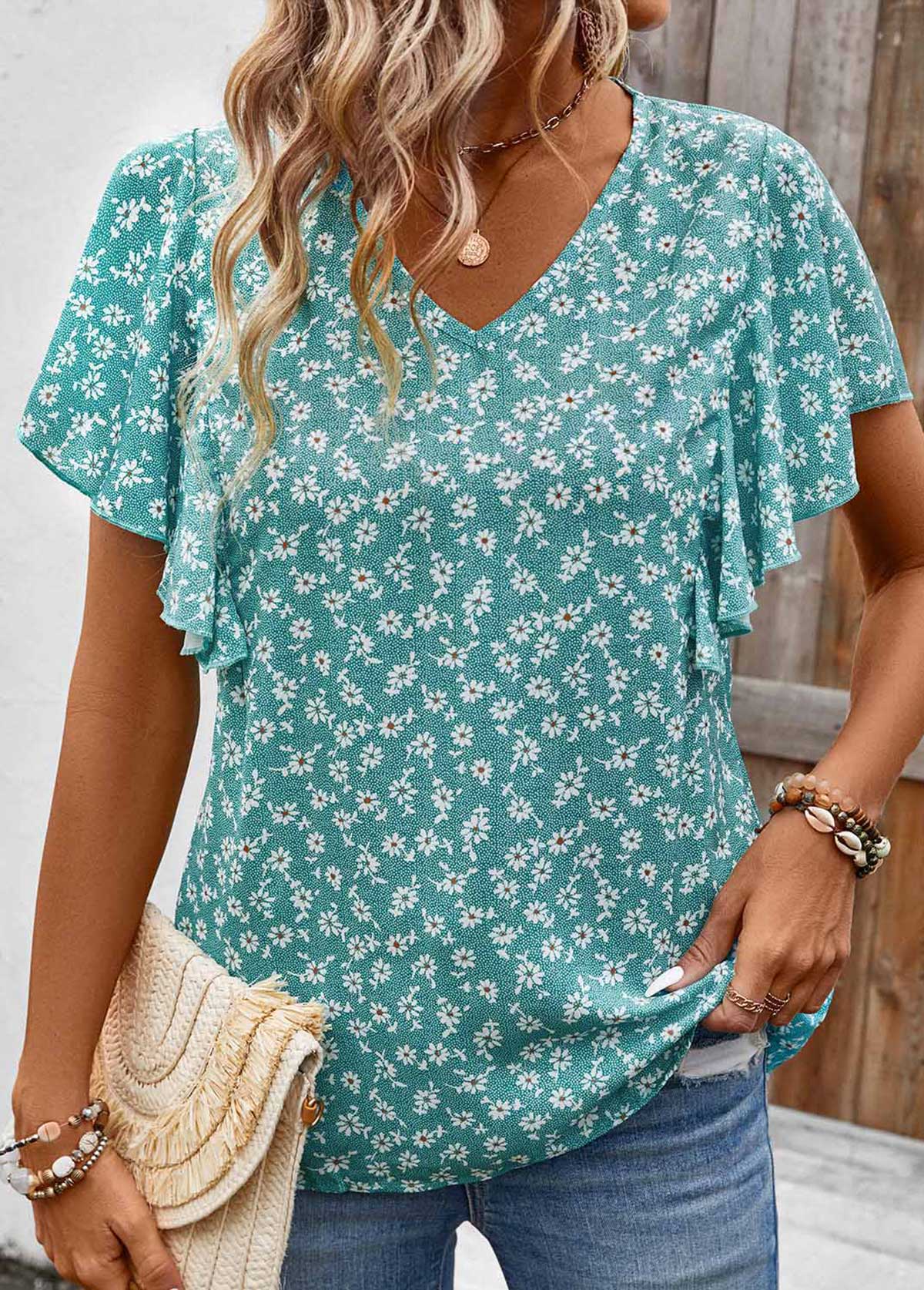 women's clothes / Tops / Blouses  /  Mint Green Ruffle Ditsy Floral Print Short Sleeve Blouse