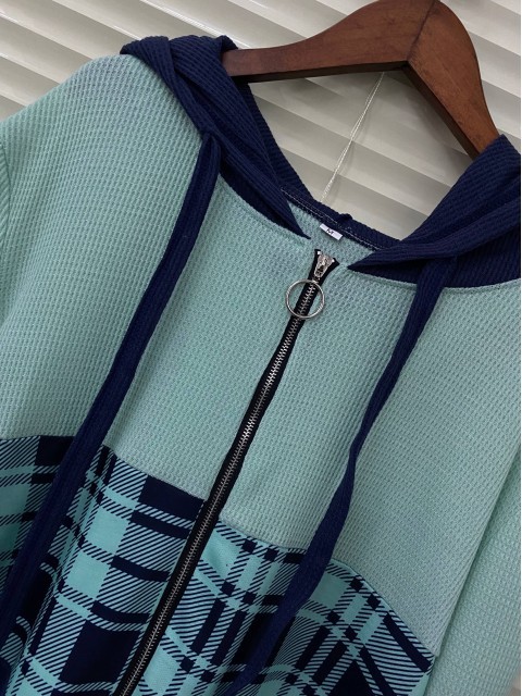 Sage Green Tummy Coverage Plaid Long Sleeve Hoodie
