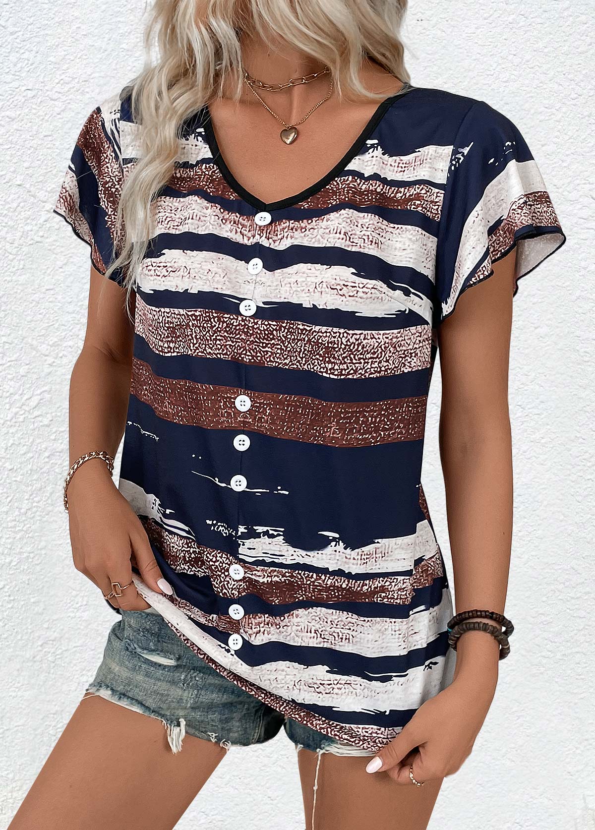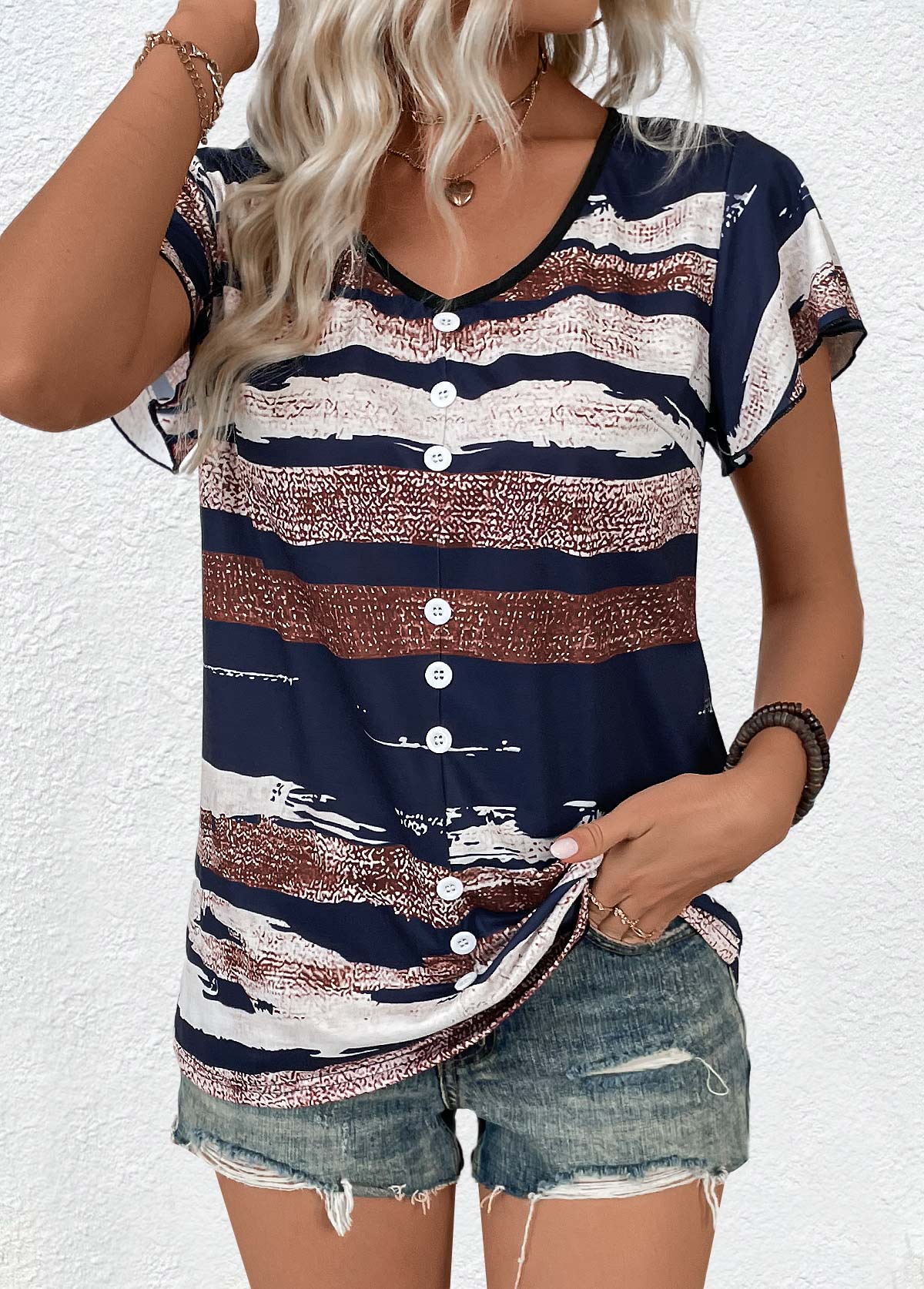 • Multi Color Button Geometric Print Short Sleeve T Shirt