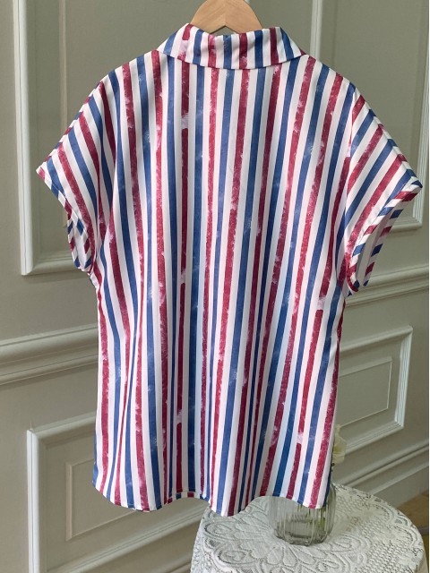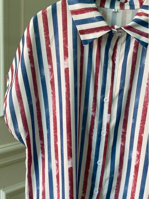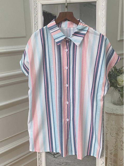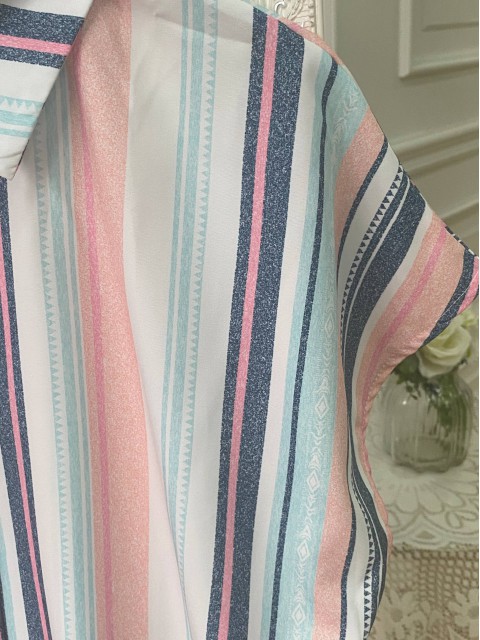 Blue Striped 3/4 Sleeve Split Neck Shirt
