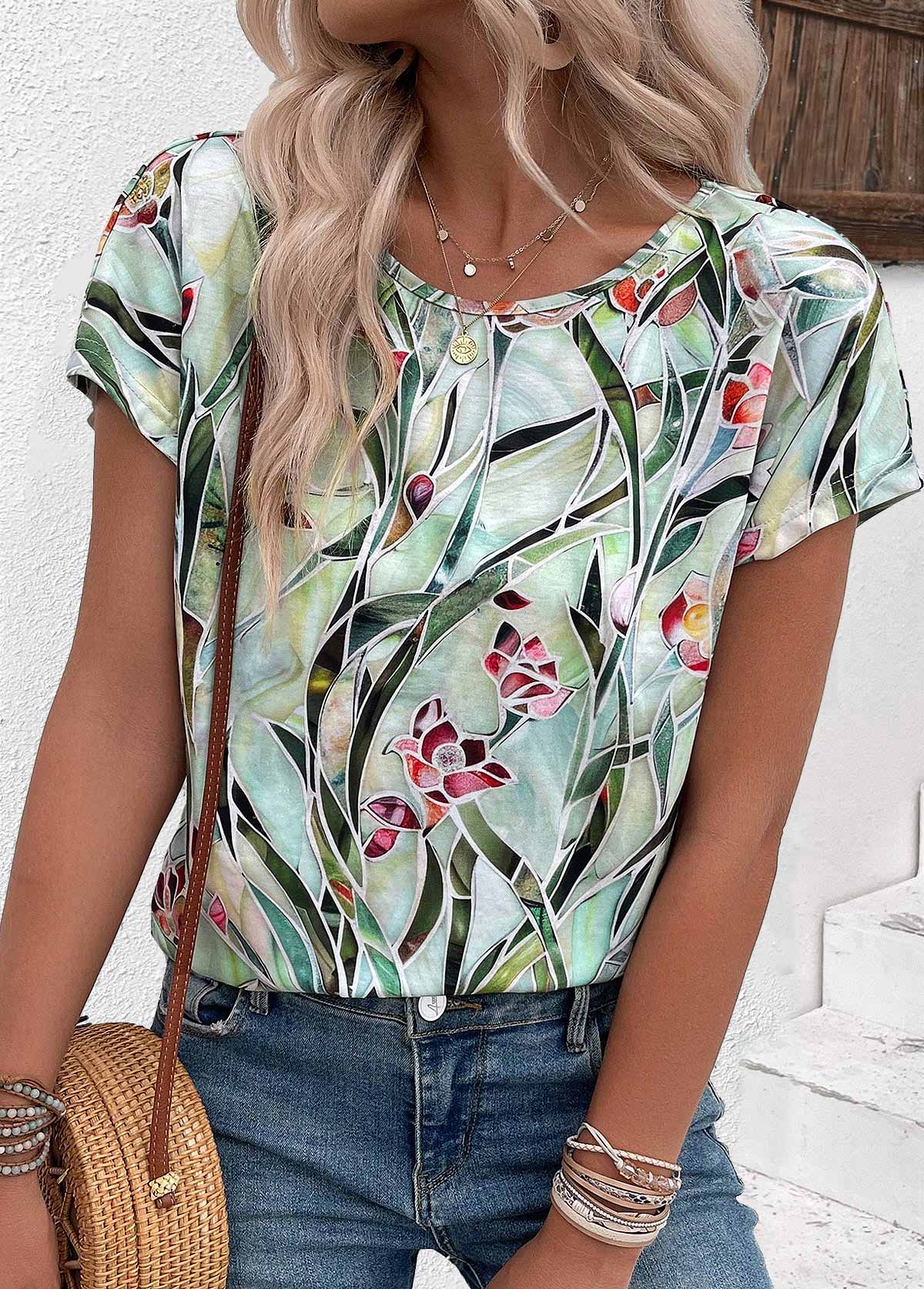 Light Green Tummy Coverage Tropical Plants Print T Shirt
