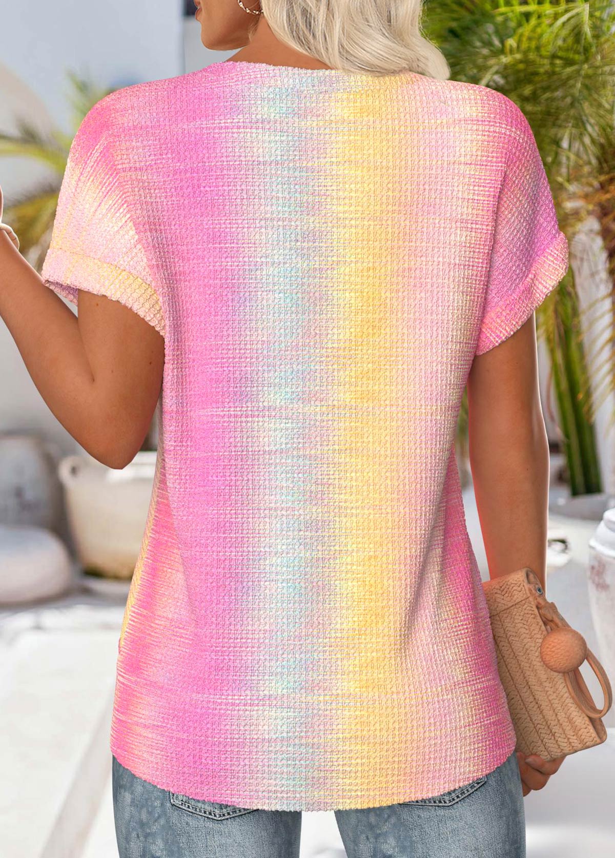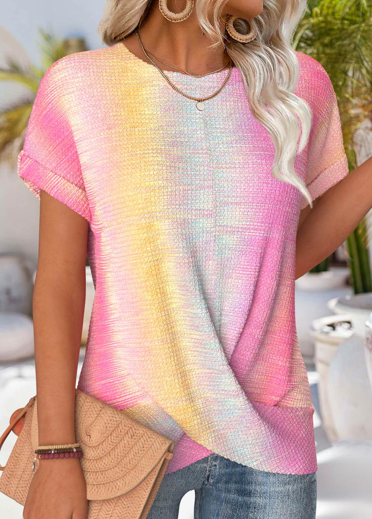 Pink Tropical Plants Print Twist Short Sleeve T Shirt