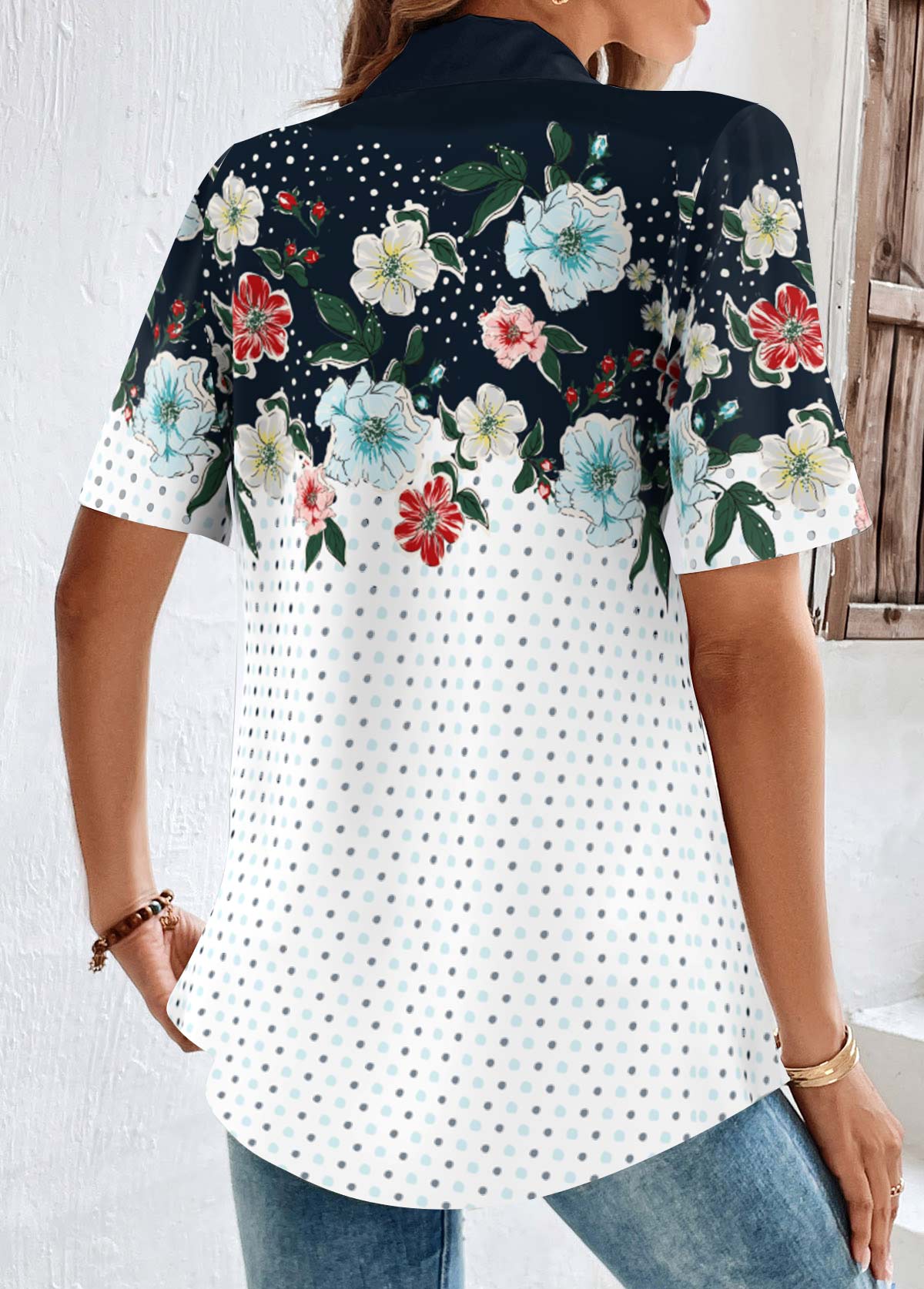 • Navy Button Floral Print Short Sleeve Shirt Collar Blouse | thumb picture