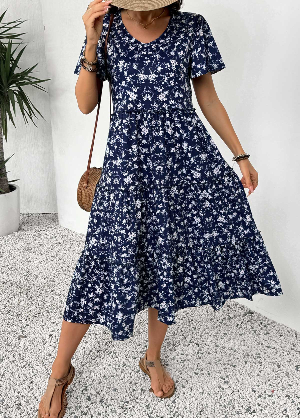 women's clothes / Dresses  /  Navy Ditsy Floral Print Short Sleeve V Neck Dress
