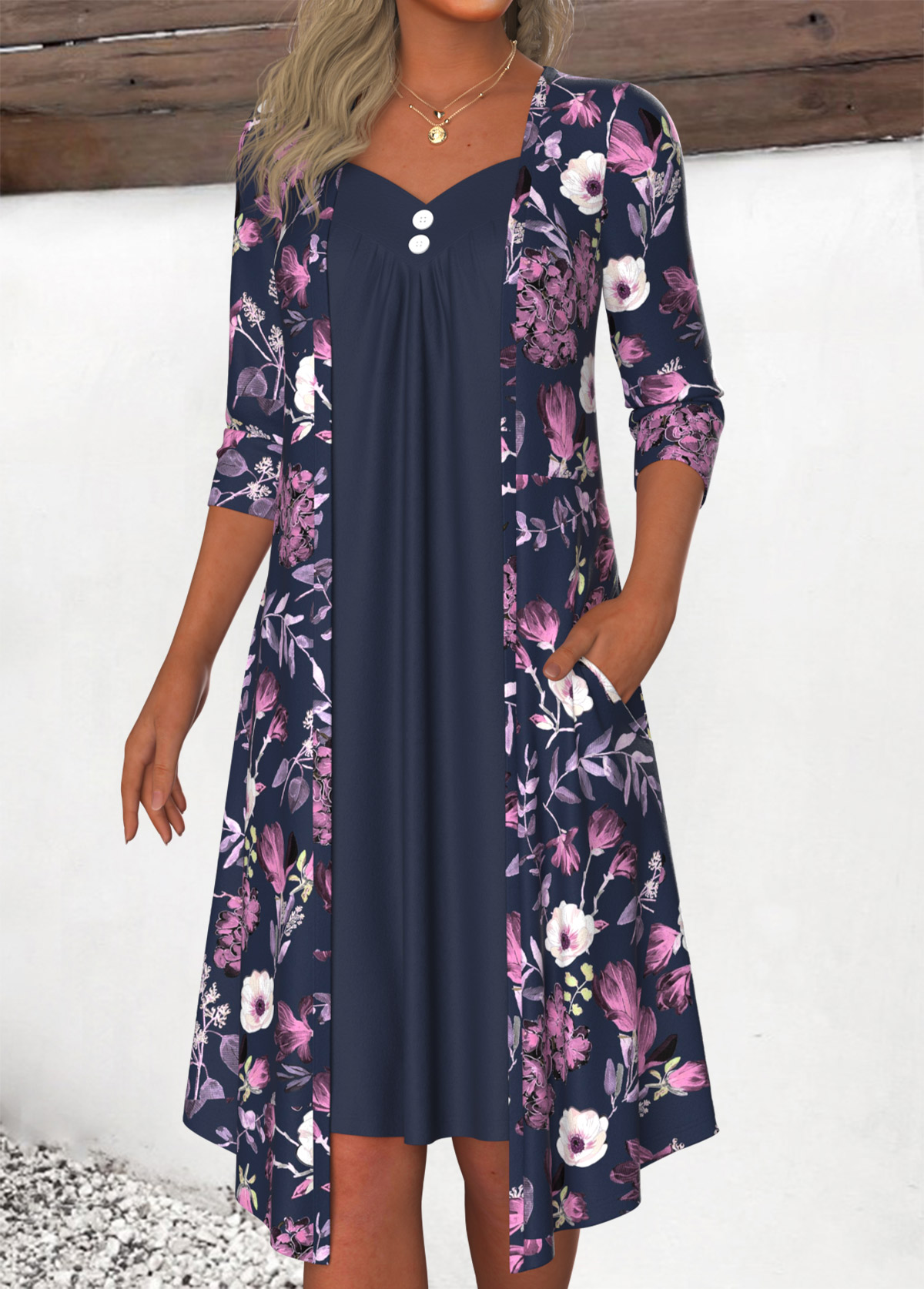 Navy Tummy Coverage Floral Print Sleeveless V Neck Dress