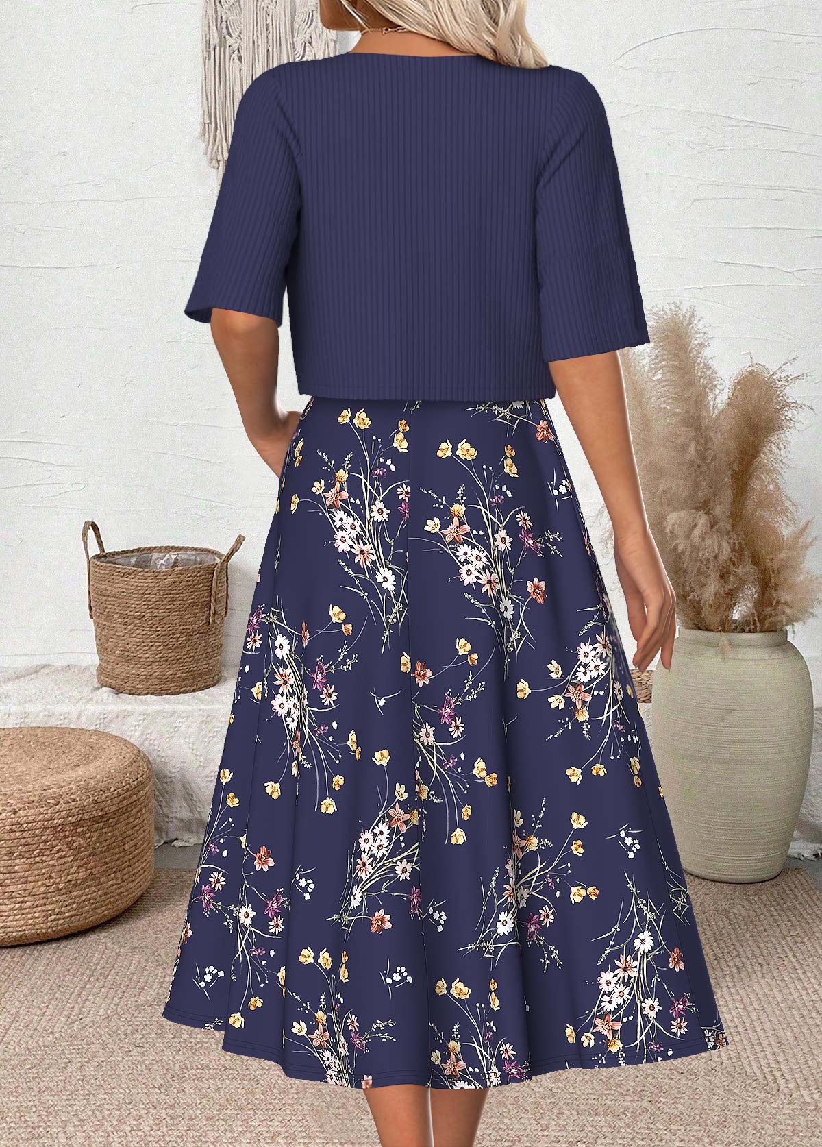 Navy Tummy Coverage Paisley Print Dress and Cardigan