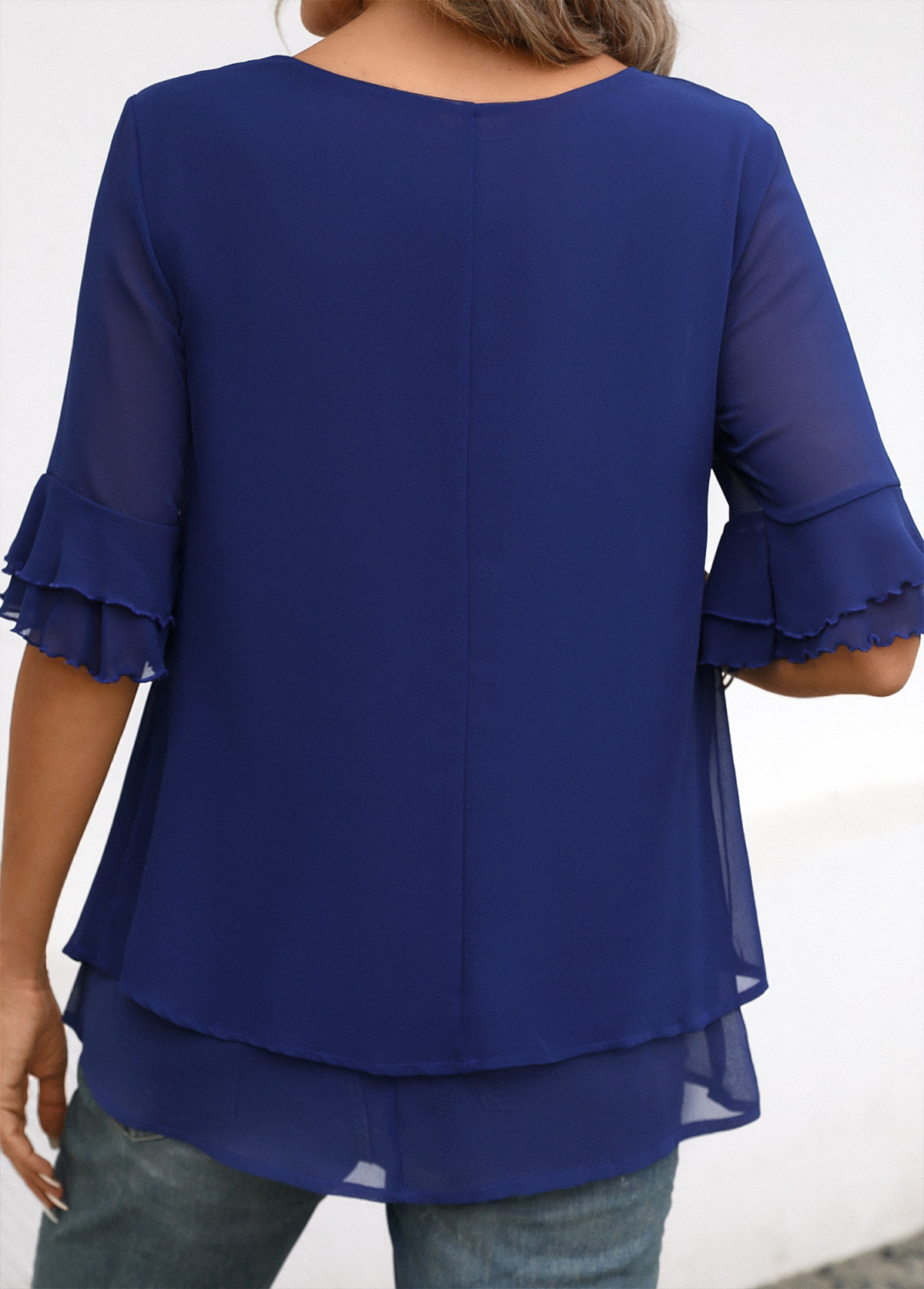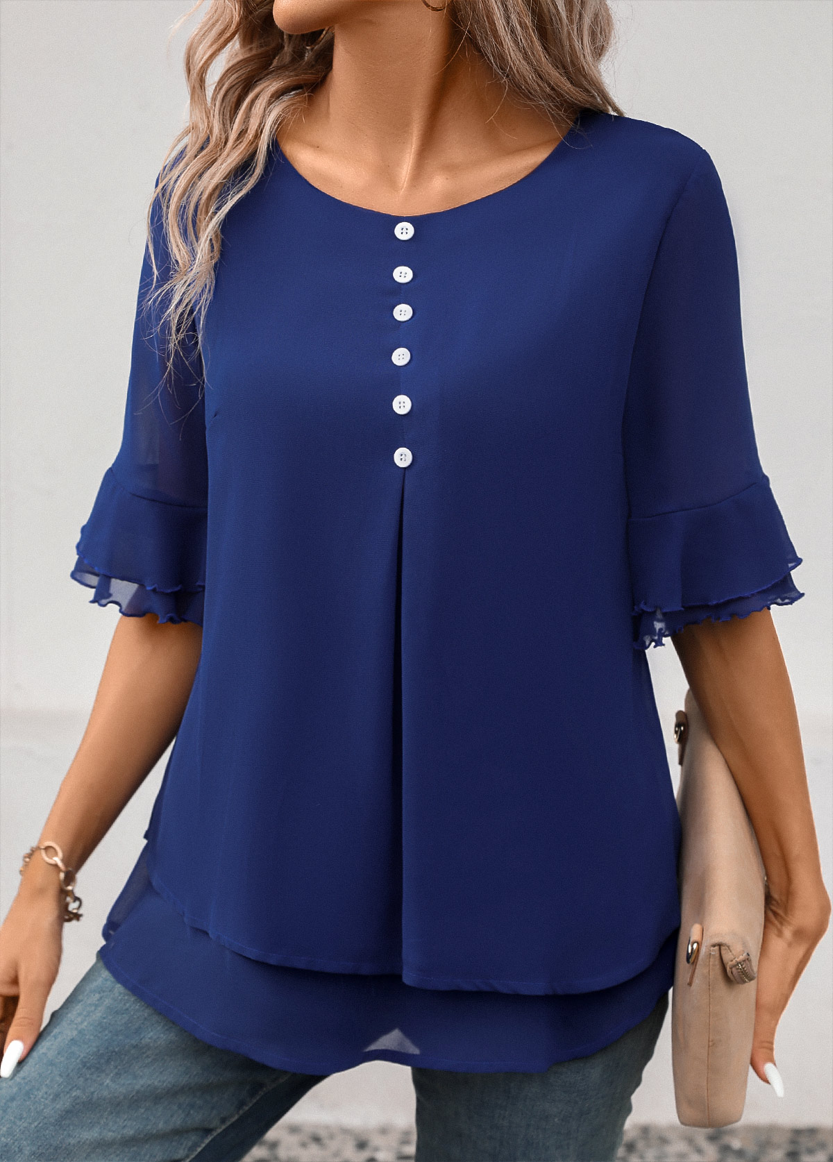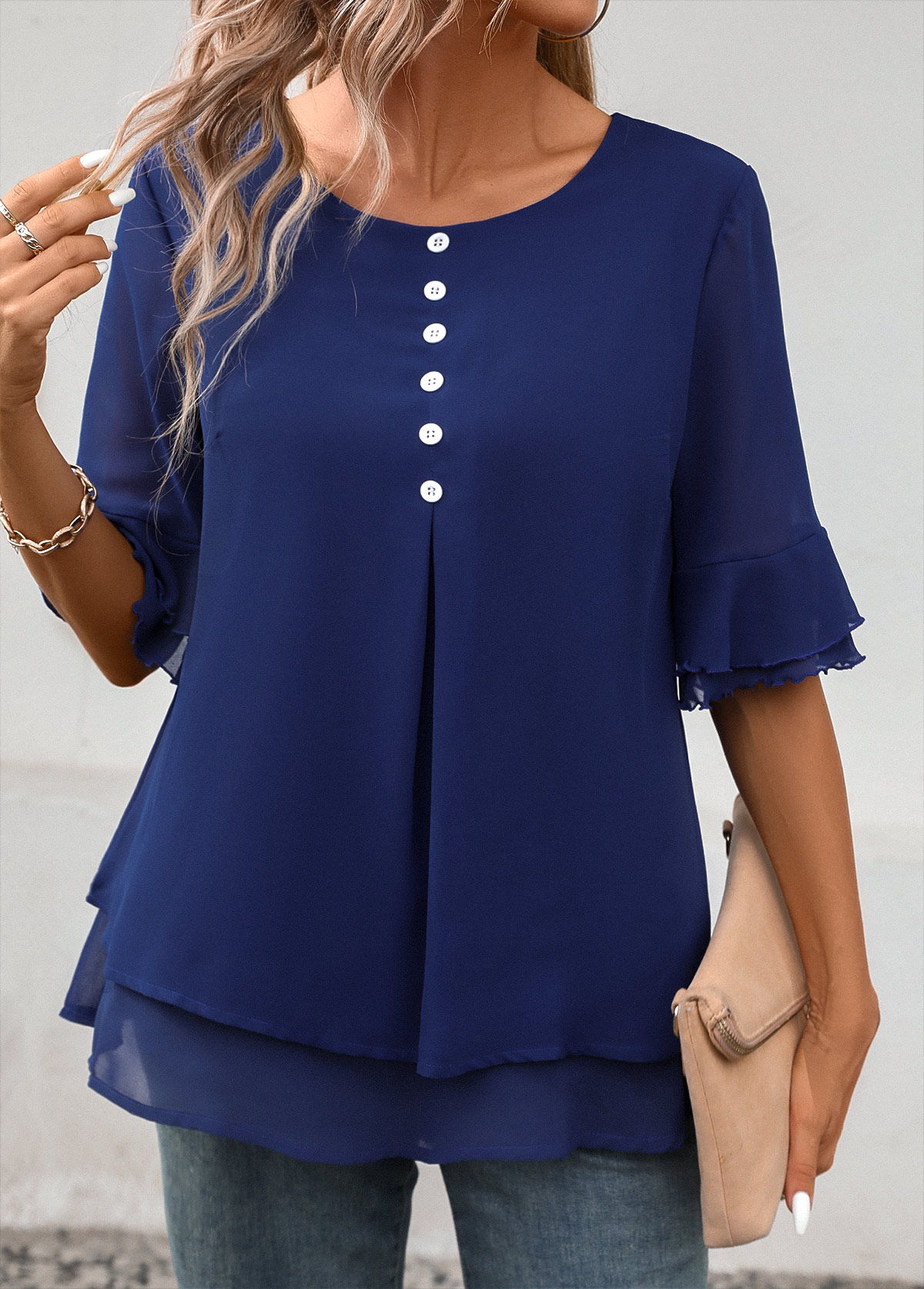 • Navy Layered Short Sleeve Round Neck Blouse | thumb picture